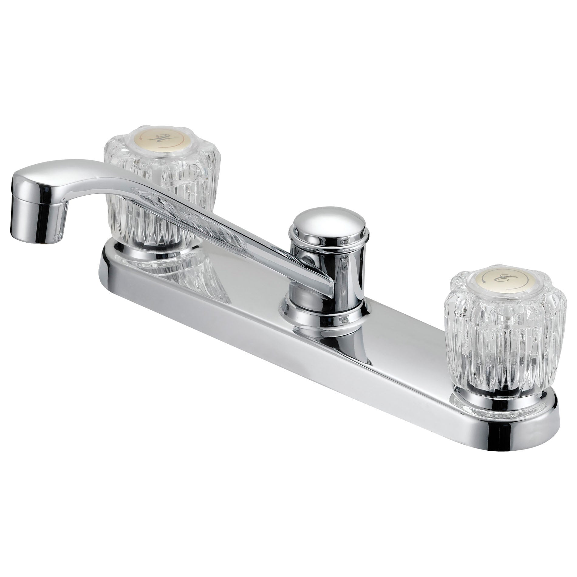 The Boston Harbor kitchen faucet without side spray is made from a durable metal construction. The finish is chrome with an acrylic round handle.