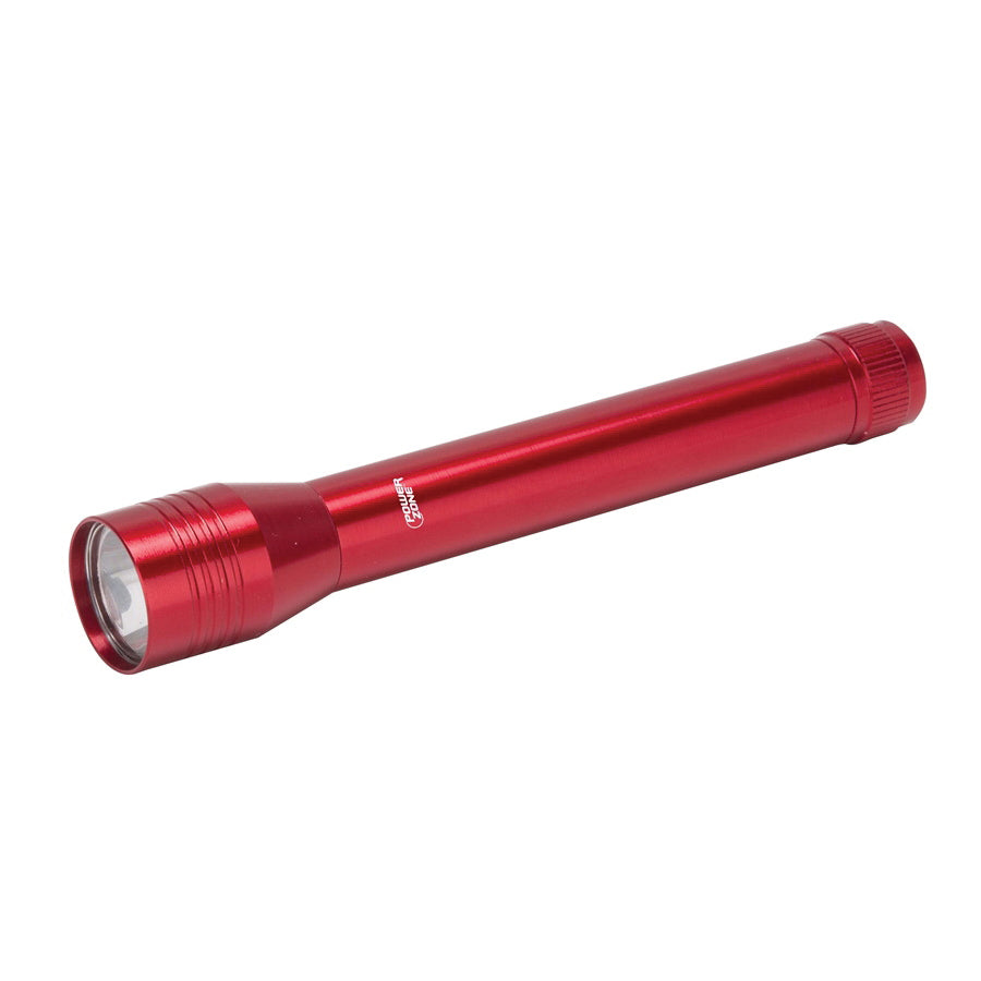 Aluminum LED flashlight is water resistant and has simple push-button operation. 150 Lumens. Powered by 2 AA batteries, included.