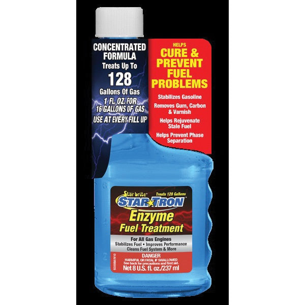 Star Tron® enzyme fuel treatment is a multifunctional fuel additive which uses a unique enzyme technology that allows all engines to start easily and run smoothly, even when using ethanol-blended fuel or after sitting idle for months. Star Tron® eliminates and prevents ethanol fuel problems. Star Tron® breaks down excess water and sludge to sub-micron size, allowing it to be safely burned away during normal engine operation which helps prevent phase separation. Star Tron® increases fuel economy by cleaning the entire fuel delivery system, removing performance robbing gum and varnish deposits while modifying how fuel burns. This results in more complete and uniform combustion, maximum performance, increased fuel efficiency, reduced emissions and reliable operation. Star Tron® will stabilize fuel for up to 2 years, preventing the formation of gums and other solids that clog carburetors and fuel injectors. Star Tron® can help rejuvenate old and sub-spec fuel.