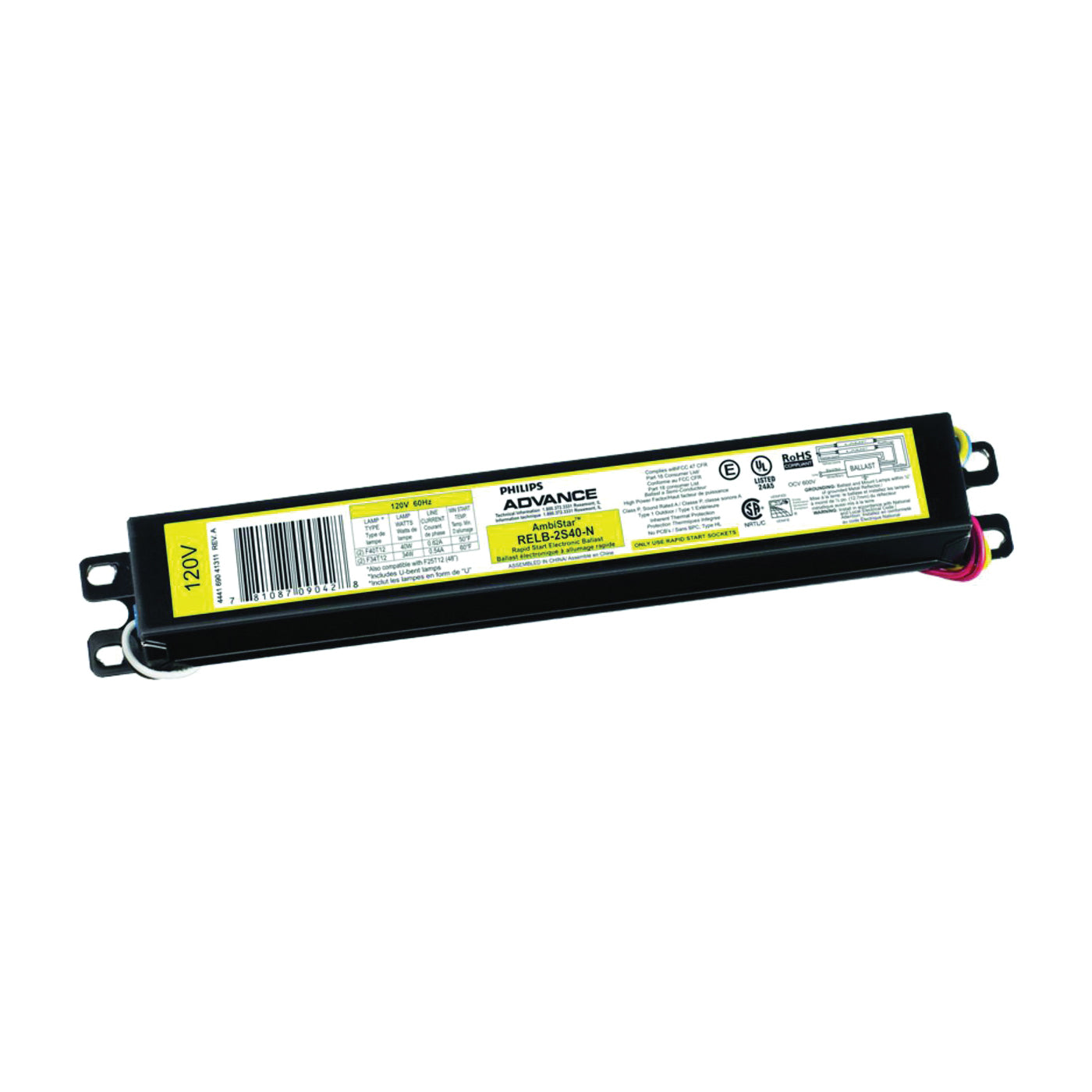 For use with one or two F30T12, F34T12 or F40T12 bulbs. Minimum start temperature 50 deg. 120 to 277 V. UL and CSA listed.