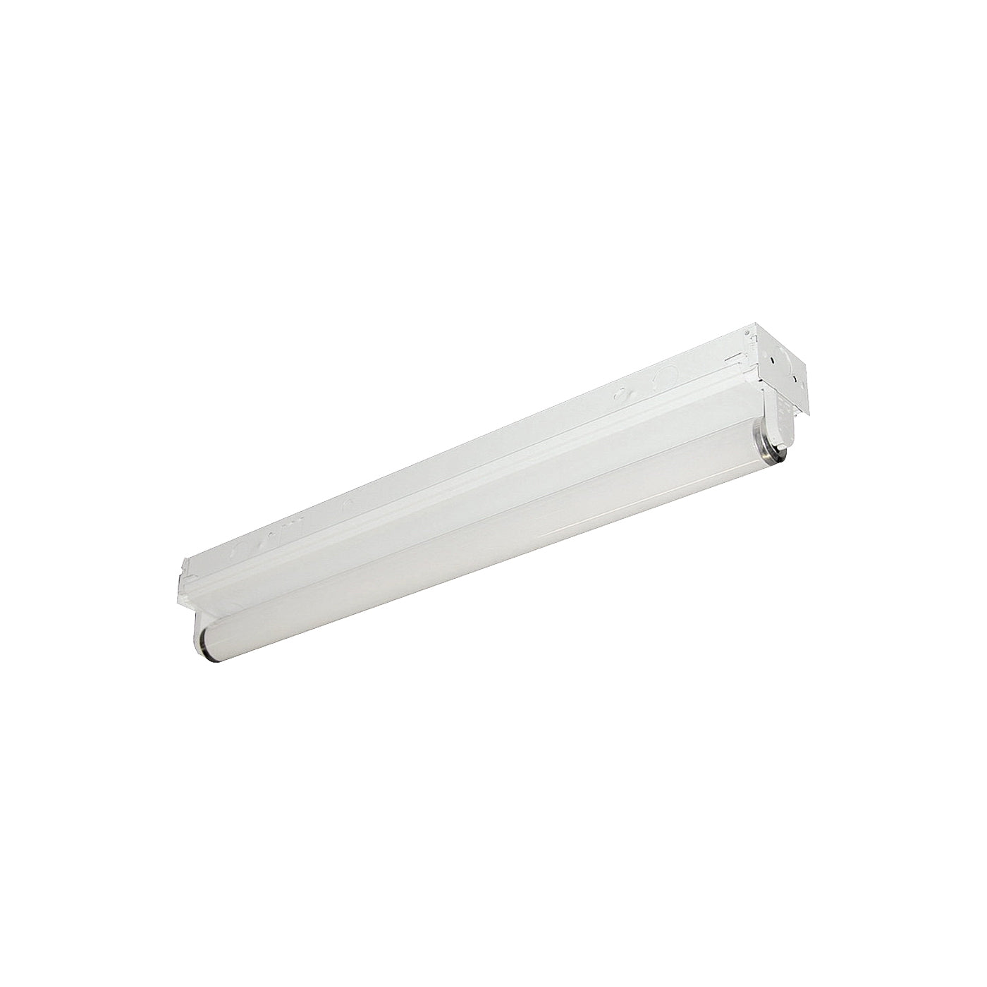 Provides general illumination for indoor and damp applications. Product features include snap assembly of ends, socket bars and wire way cover. Heavy-duty channel is die formed from 22 ga steel. Channel cover snaps to housing for access to wire way. Electrical connections are made inside the wire way. Standard mounting holes and wiring knockouts are included. Fixture can be mounted individually or in continuous rows for surface or suspended mounting. Applications include light commercial, industrial, retail, coves and displays. Fluorescent lamps are exposed, no diffuser. Finished in lighting-grade white baked gloss enamel paint. Use with T8 fluorescent linear lamps, not included. cULus listed for damp locations.
