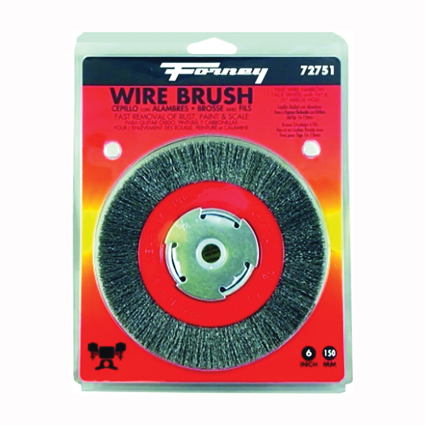 • Forney 72751 Wire Bench Wheel Brush, 6 in Dia, 1/2 to 5/8 in Arbor/Shank, 0.008 in Dia Bristle