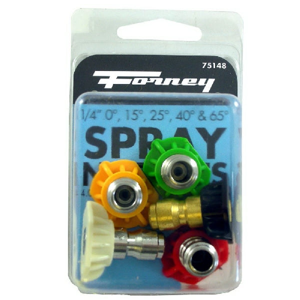 Forney Soap Nozzle, 1/4 in Nozzle, 4 mm Orifice, 0, 15, 25, 40, 65 deg Angle, 4000 psi Pressure, Stainless Steel, Includes: #1 0 deg Blasting (Red), #2 15 deg Chiseling (Yellow), #3 25 deg Flushing (Green), #4 40 deg Washing (White) and #5 65 deg Soap (Black) Spray Nozzles