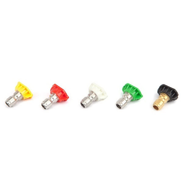 | Includes | #1 0 deg Blasting (Red), #2 15 deg Chiseling (Yellow), #3 25 deg Flushing (Green), #4 40 deg Washing (White) and #5 65 deg Soap (Black) Spray Nozzles |