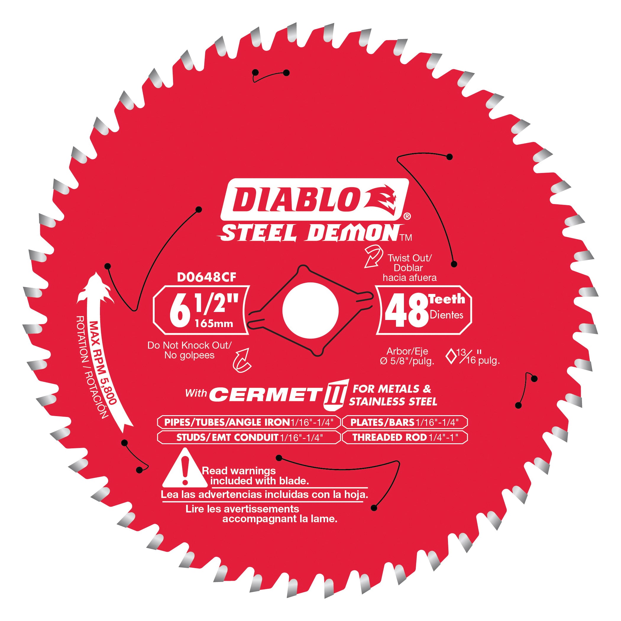Diablo Saw Blade, 6-1/2 in Diameter, Cermet Cutting Edge, Triple Chip Teeth, 48 Teeth, 5/8 in Arbor, 11,000 rpm Speed, 2 deg Hook Angle, 0.071 in Kerf, Carbide/Titanium, Applicable Materials: Ferrous Metals, Suitable for: Cordless Circular Saw