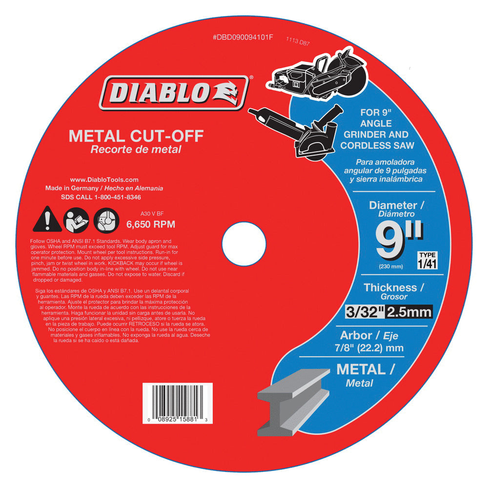 Diablo premium cut-off discs provide premium performance and increased productivity in metal cutting applications. Featuring an aluminum oxide blend, the disc quickly cuts through material and offers an extra long cutting life. Fully reinforced for hand held work, this disc is ideal for working in hard to reach areas.