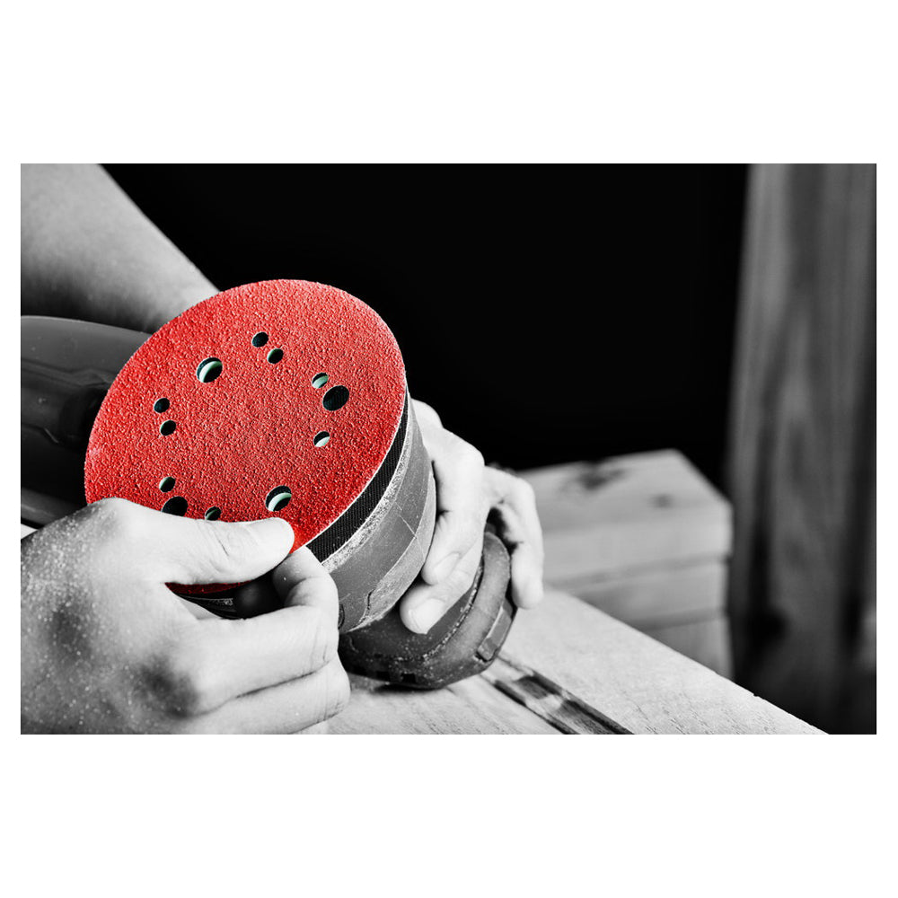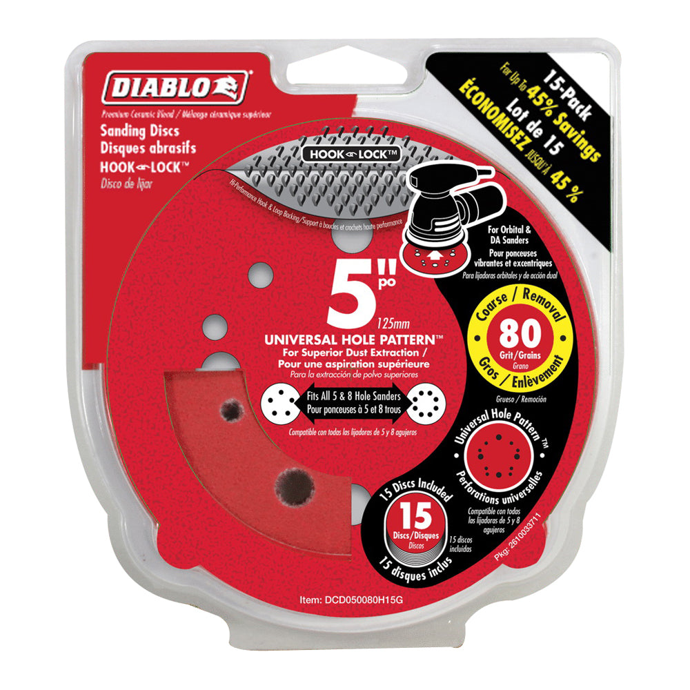 Diablo's premium 5 in 80 grit universal, 12-hole random orbital sanding discs with Hook & Lock™ backing include break-through innovations that improve performance, extend sanding life and increase productivity. Featuring a premium ceramic blend, these discs remove material faster than other sanding discs and offer an extra long sanding life. Clog-SHIELD™, Diablo's own blend of grinding agents, reduces loading thus maximizing productivity. The better grain bonding system, ENDURA-BOND™, provides Diablo's sanding discs with longer life and extreme durability.