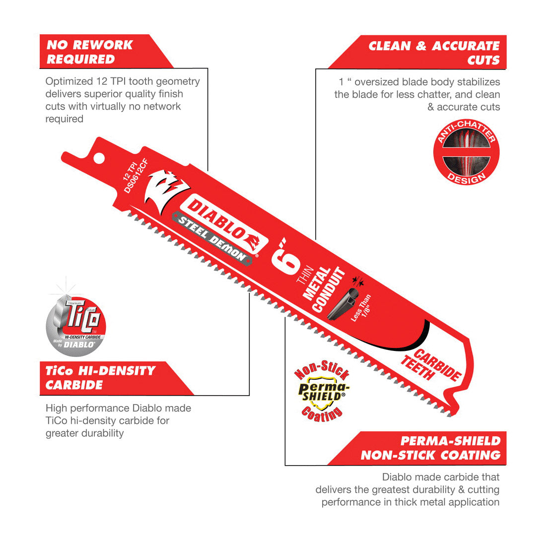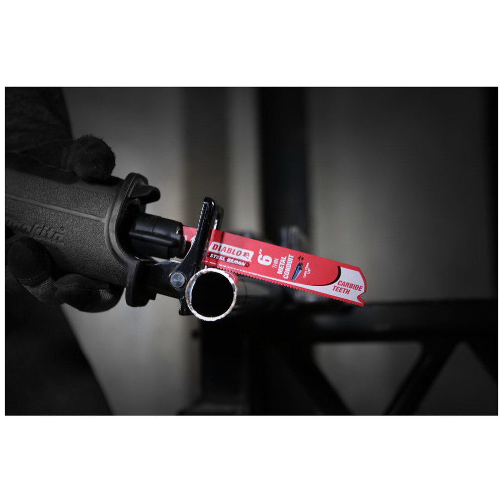The latest addition to Diablo's Steel Demon® carbide reciprocating blade family is the industry's first carbide teeth blade for thin metal conduit and tubing. A proprietary high-performance carbide formulation extends the cutting life up to 50 times longer, making this the most efficient cutting solution in thin metal conduit and tubing applications. The blade's optimized tooth count effortlessly rips through thin metals with ease, producing clean cuts that require virtually no rework. A 1 in blade body height provides the rigidity and stability needed for straight cuts with less vibration.