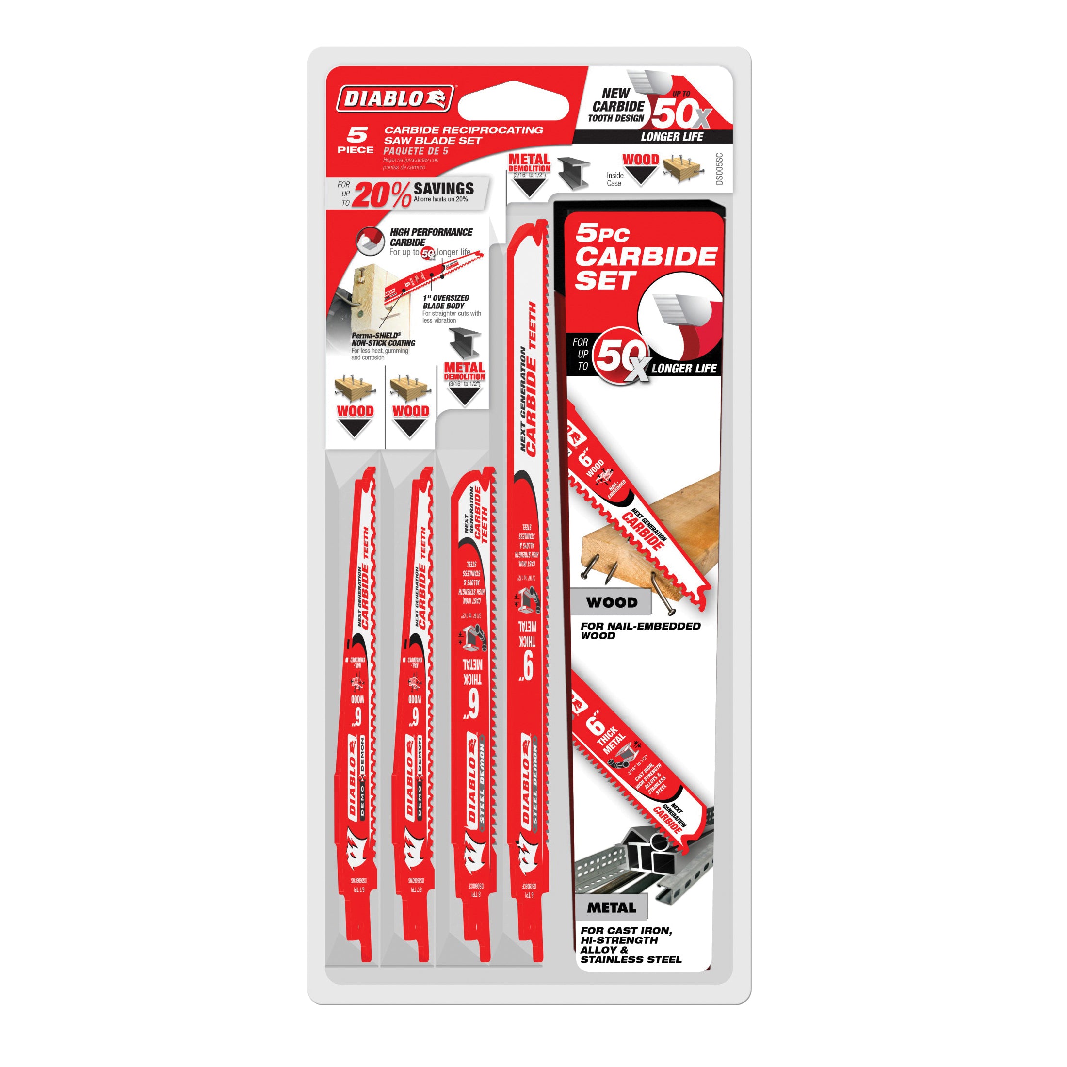 Diablo's new 5-piece carbide reciprocating blade set consists of three Demo Demon blades for nail-embedded wood and 2-steel Demon blades for metal cutting, including high-strength alloys, cast iron and stainless steel, this combination carbide reciprocating blade set allows pros to blaze through nail-embedded wood with amazing ease to facilitate fast teardowns of walls and framing materials and slice through metal so you can quickly dismantle a variety of pipes, bars and beams up to 1/2 in thick, Diablo's high-performance carbide set delivers unmatched 50X longer cutting life than standard bi-metal blades, greater durability in cutting applications and an oversized body height for straighter cuts with less vibration.