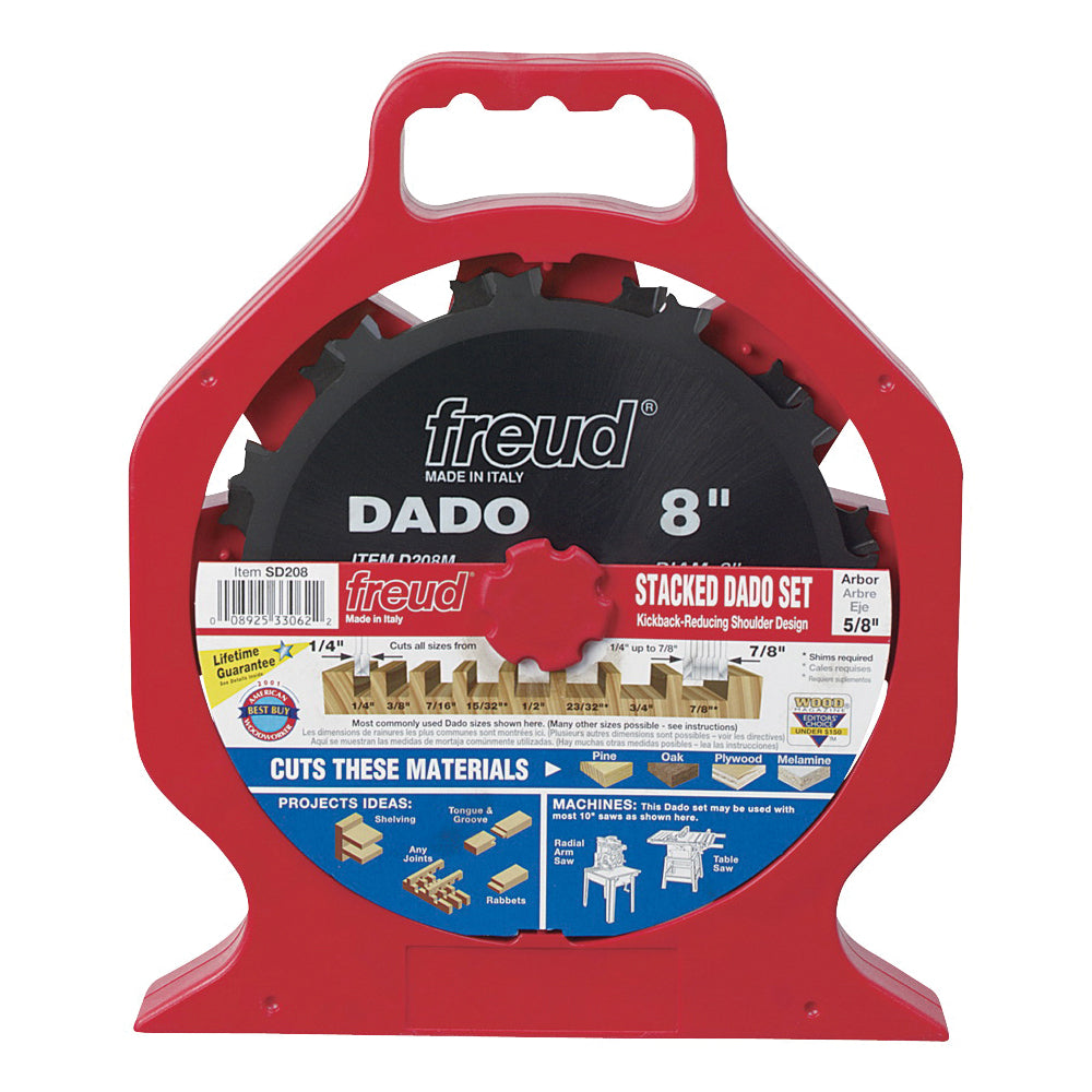 For the weekend woodworker to use on all table and radial arm saws for cutting slots, grooves, dadoes and rabbets in soft or hardwood. For underpowered saws because requires less power to feed. Negative hook angle makes flat bottom grooves and virtually splinter-free cuts. Anti-kickback design. Resharpenable set produces grooves from 1/4 to 13/16 in, in 1/16 in increments. Includes 2 outside blades, four 2-wing 1/8 in chippers and one 1/16 in chipper, 1/8 in kerf.