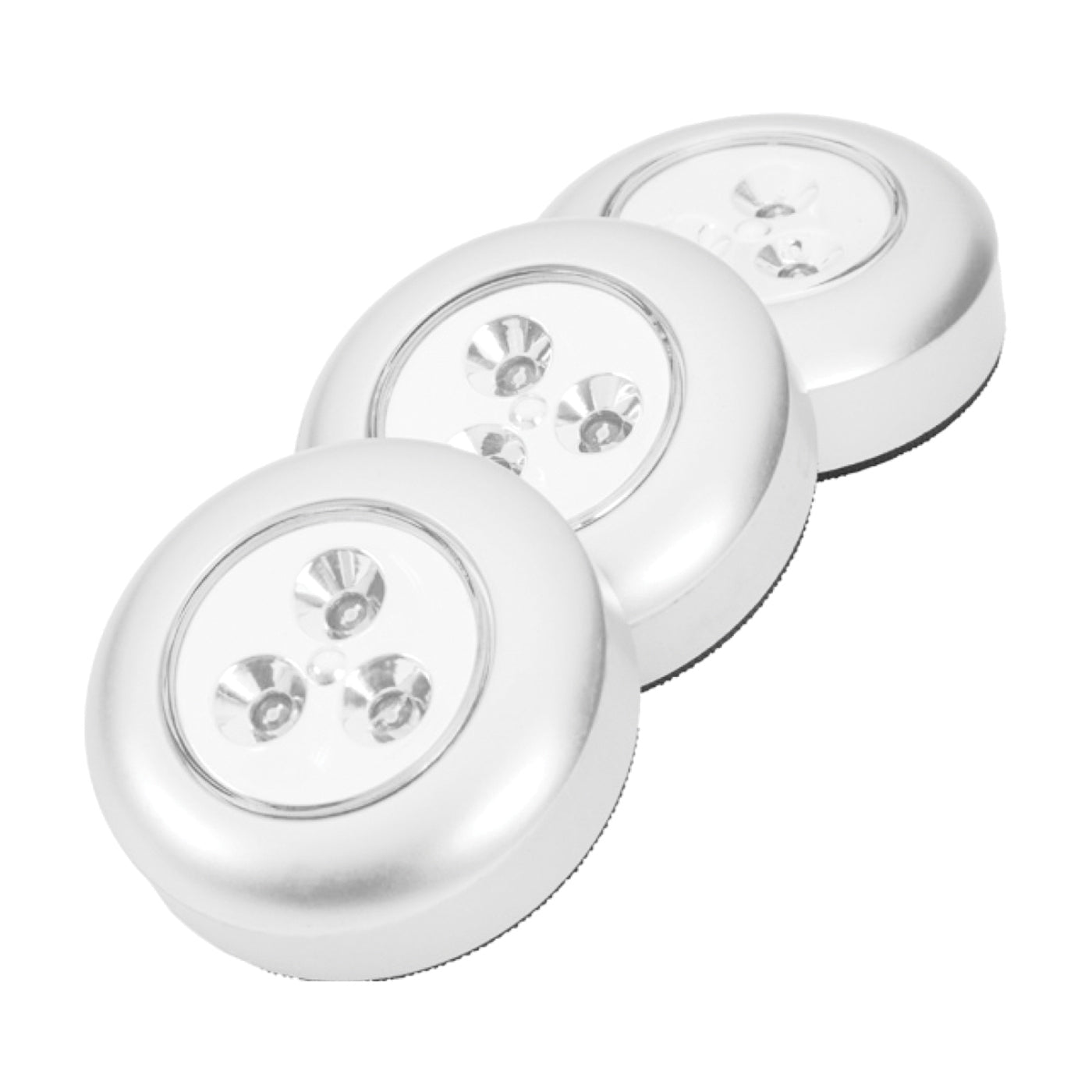 Mounts anywhere, adhesive backing. 13.5 Lumens. Tapping the center of the light turns it On/Off. Uses 3 AAA batteries (not included).