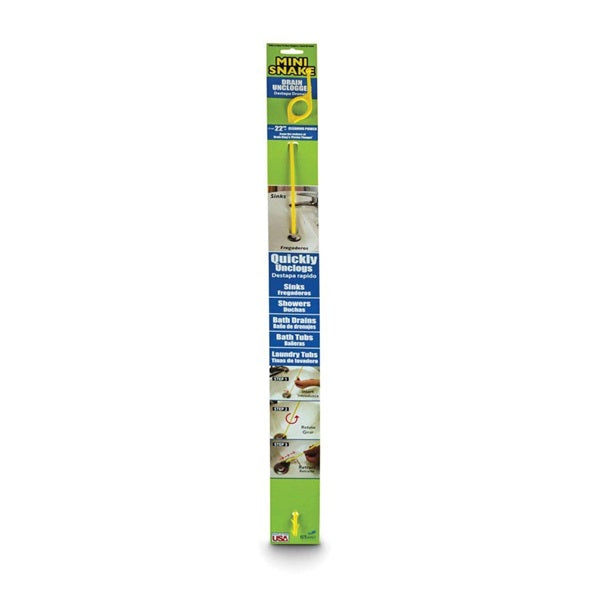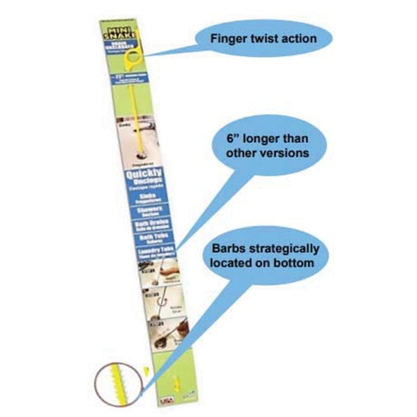 Mini snake drain cleaner. Unclogs sinks, showers, bath drains and urinals. Safe and easy-to-use. No chemicals and no need to remove drain covers. Insert mini snake in drain, rotate, then pull out debris. 2-1/2 in(handle) x 1/4 in x 26 in (auger).
