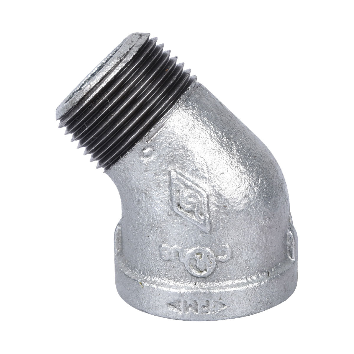 Street pipe elbow, 45 deg angle, 1 in with NPT female to male threaded connects.