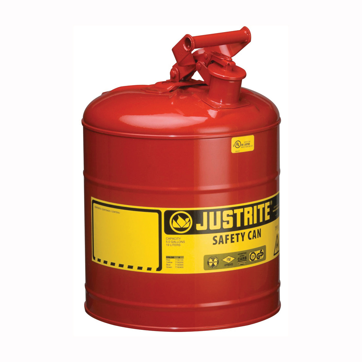 Heavy-duty, high grade coated steel construction with reinforcing ribs to strengthen sidewalls to resist chemicals and stand up to heavy abuse. Single spout for filling and pouring. Self-closing, leak-proof lid and a swinging handle for carrying heavier loads. Counterbalanced ergonomic design with full-fisted grip handle offers gravity-assisted pouring. All models are equipped with an FM-tested dual-density flame arrester, which dissipates heat to stop flashback ignition. Positive pressure relief mechanism automatically vents between 3 and 5 psig. Meets OSHA and NFPA requirements, is certified by FM, UL, ULC. Carb compliant and TUV certified. Uses funnel 11202Y.
