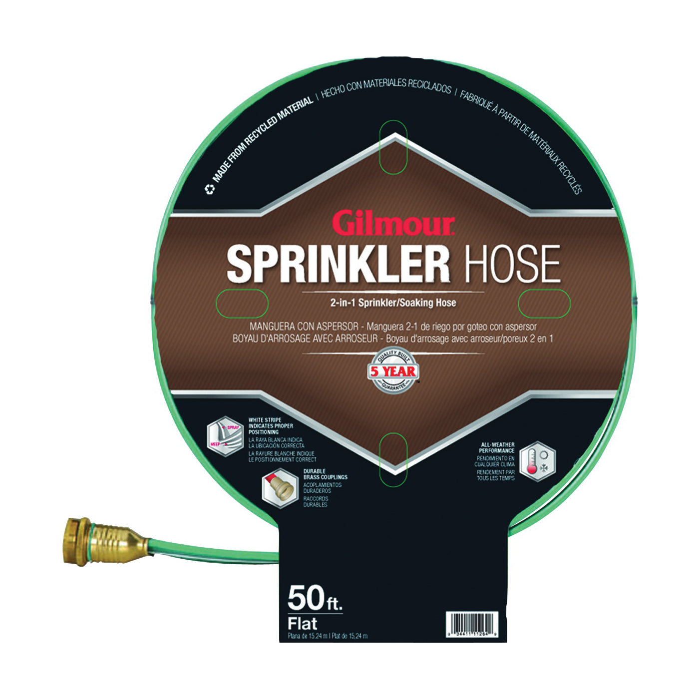 All-in-one sprinkler and soaker hose. For new grass, gardens, trees and shrubs. Consistent gentle spray. White stripe indicates proper positioning. Full-Flo brass couplings for unrestricted water flow. Lightweight and flexible for easy handling. Removable endcap for flushing.