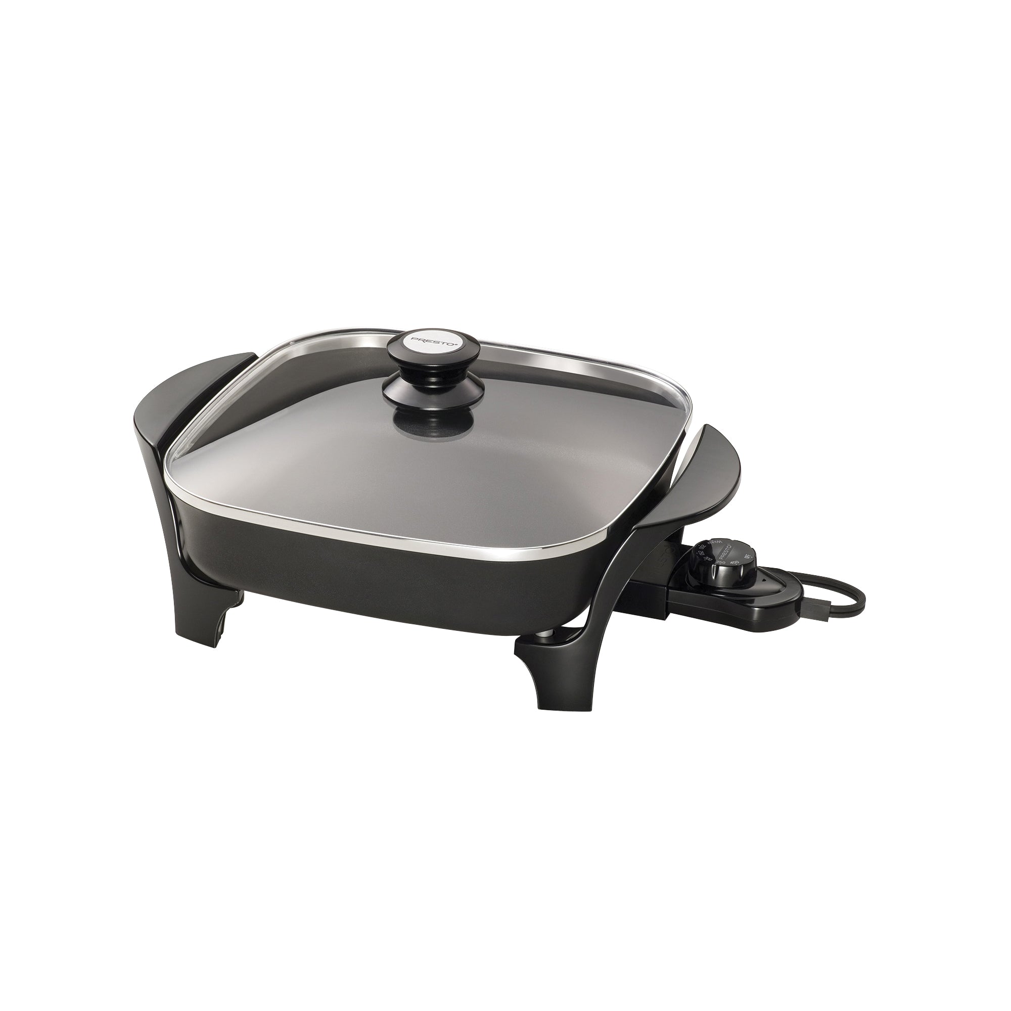 Roasts, fries, grills, stews, bakes, makes casseroles and more. Tempered glass cover lets you see what is inside. High sidewalls & tempered glass cover make it ideal for breakfast, lunch, dinner & entertaining. Control Master heat control automatically maintains the proper cooking temperature. Deluxe non-stick surface inside and out for stick-free cooking and no-scour cleaning. Dishwasher-safe with heat control removed. 120 VAC, 1000 W.