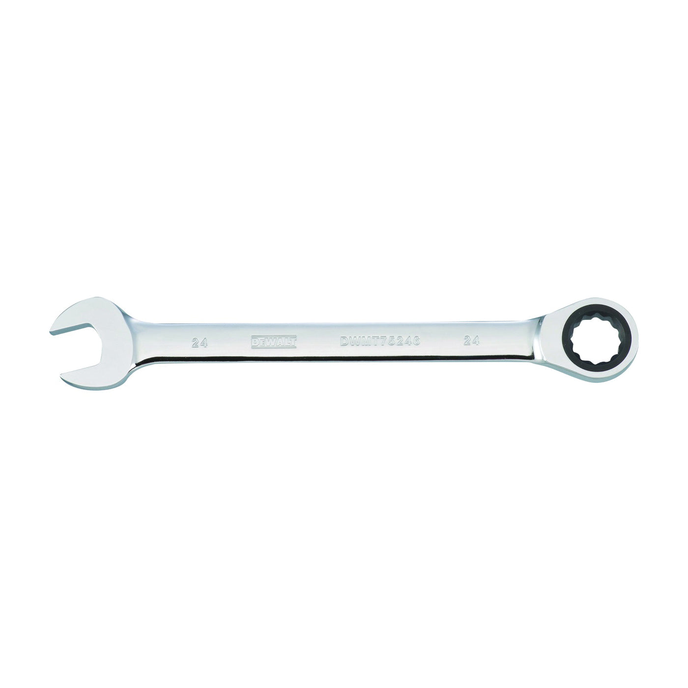 DeWALT Combination Wrench, SAE/Metric: Metric, Head Size: 24 mm, Offset Angle: 15 deg, Box End Thickness: 9/16 in, Box End Width: 1-7/8 in, Open End Thickness: 7/16 in, Open End Width: 2-1/32 in, Comfort-Grip Handle, Chrome, 12-25/32 in L