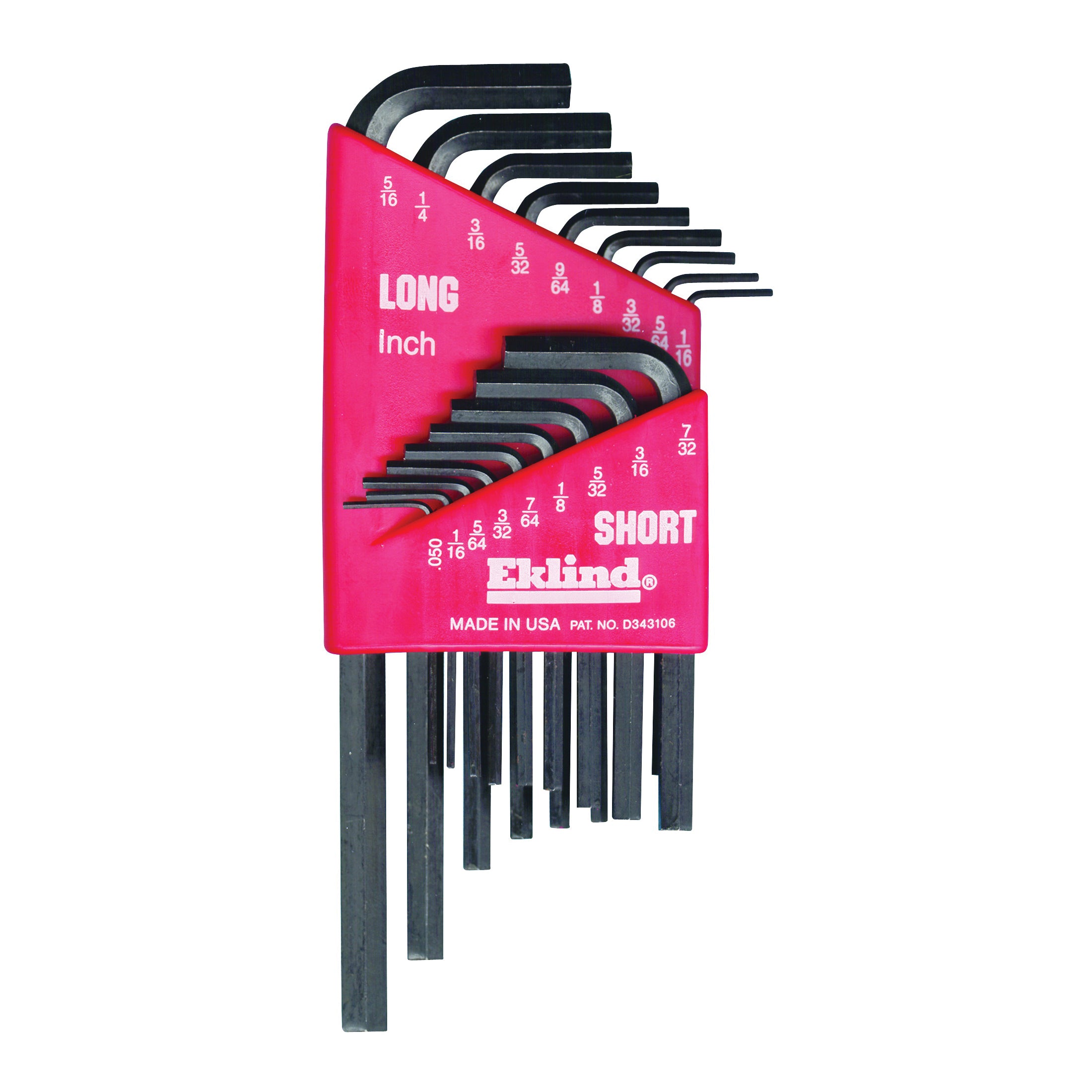 Made with Eklind alloy steel that has been heat-treated for optimum strength and ductility with a black finish to resist rust. Sizes included are 0.050 in, 1/16 in, 5/64 in, 3/32 in, 7/64 in, 1/8 in, 5/32 in, 3/16 in, 7/32 in, 1/16 in, 5/64 in, 3/32 in, 1/8 in, 9/64 in, 5/32 in, 3/16 in, 1/4 in, 5/16 in and holder.