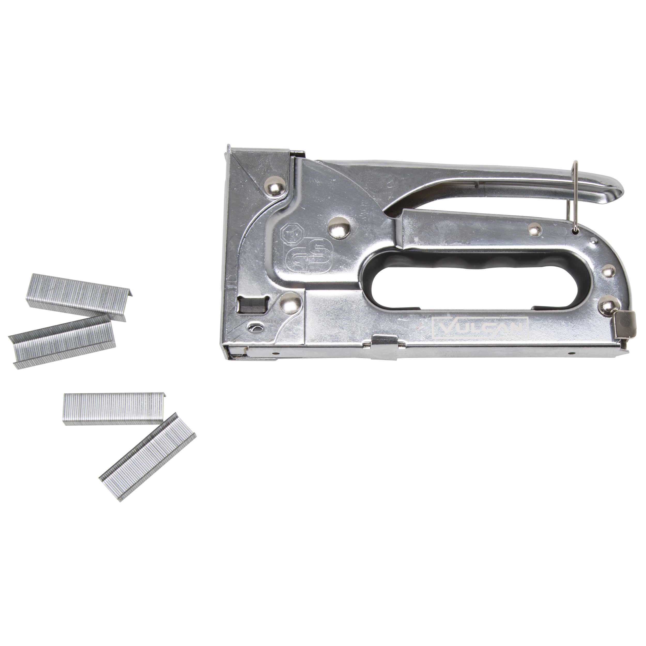 The Vulcan staple gun is chrome-plated with a steel ergonomic handle. It includes 200 staples.