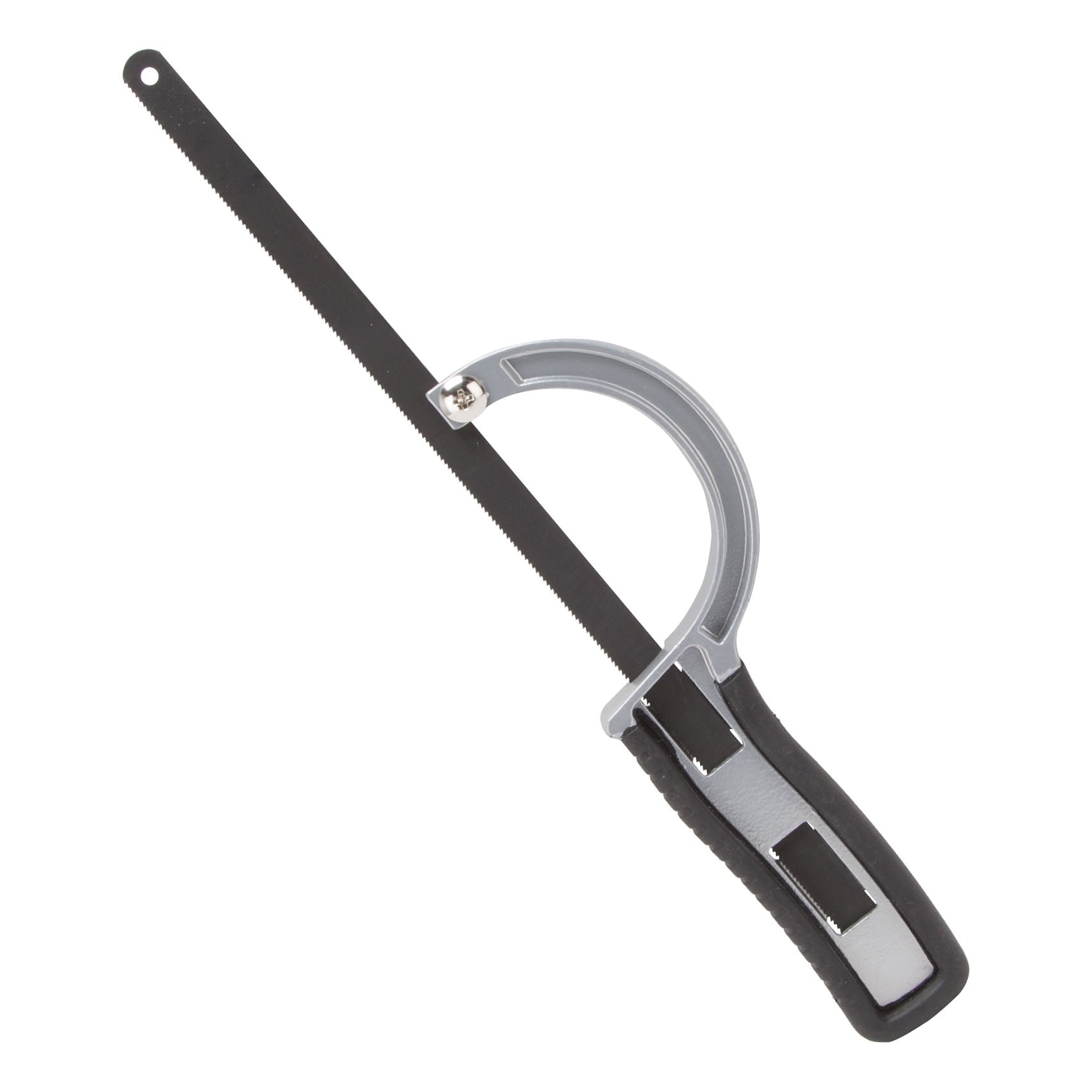 The Vulcan mini hacksaw blade teeth are 18 per inch with a blade length of 12 in L. The blade material is HCS. This hacksaw has a rubber comfort-grip handle.