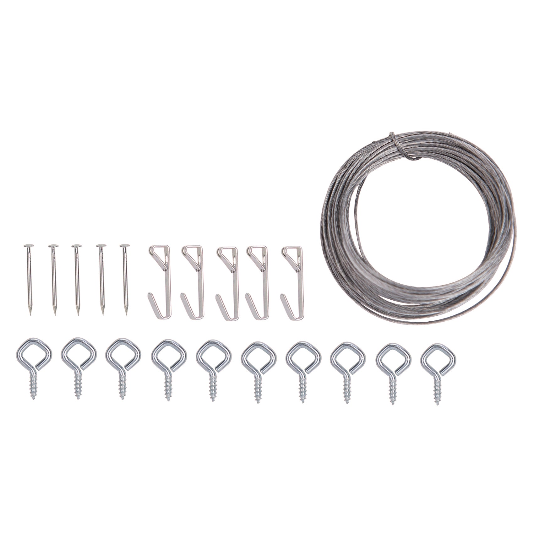 Use for drywall/plaster wall surfaces. 10 lb weight capacity, steel, zinc plated finish. Includes 5 hangers, 5 nails, 10 eyes, and 15 ft #2 picture wire.