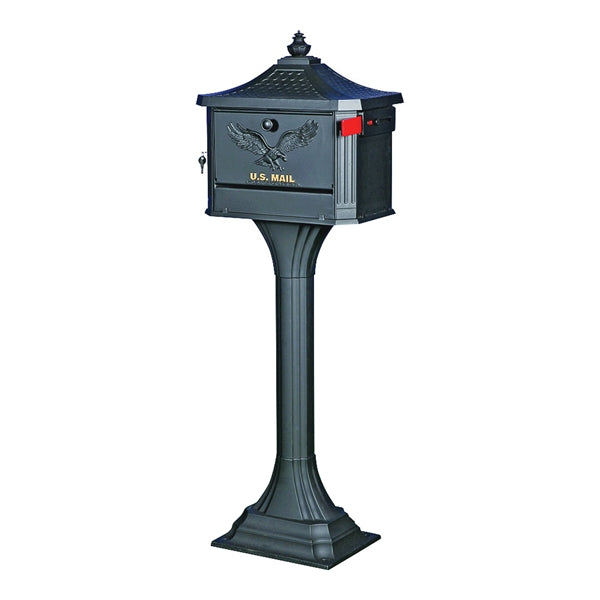 Constructed from heavy-duty cast aluminum, weather-durable, powder-coated finish will not rust. Serves as a full service locking mailbox and large capacity holds several days of mail. Assembly hardware is included for easy concreting. USPS approved. Dimensions of 50-1/4 in H x 18 in W x 12-1/2 in D.