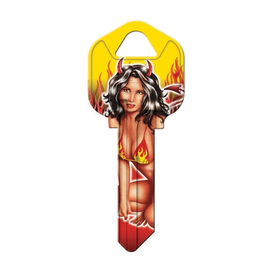 Hy-Ko Key Blank, Design/Theme: Woman/Flames, Key Number: KW1, Brass, Nickel-Plated, Dimensions: 0.87 in W x 0.08 in D x 2.05 in H, Suitable for: Kwikset KW1 Keyways