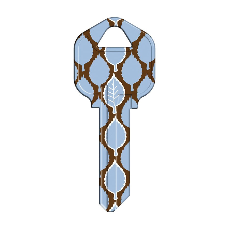 Hy-Ko Key Blank, Design/Theme: Leaves, Key Number: KW1, Brass, Blue/Brown, Nickel-Plated, Dimensions: 0.87 in W x 0.08 in D x 2.05 in H, Suitable for: Kwikset KW1 Keyways
