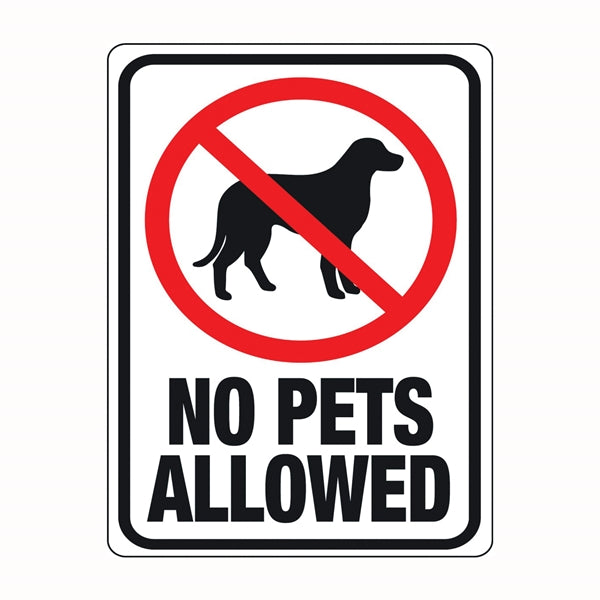 Weather-resistant, durable, bright polystyrene sign with attention-getting black lettering on a white background. Sign states "NO PETS ALLOWED" with a red and black symbol.