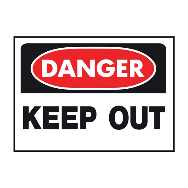 Red, black and white coloring. Durable and weather-resistant. Use in industrial workplace settings. Sign states "DANGER KEEP OUT".