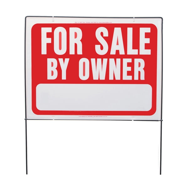 weather-resistant. Double-sided, bold lettering maximizes visibility. Sign comes attached to frame, no installation necessary. Red background with white lettering. Sign states "FOR SALE BY OWNER".