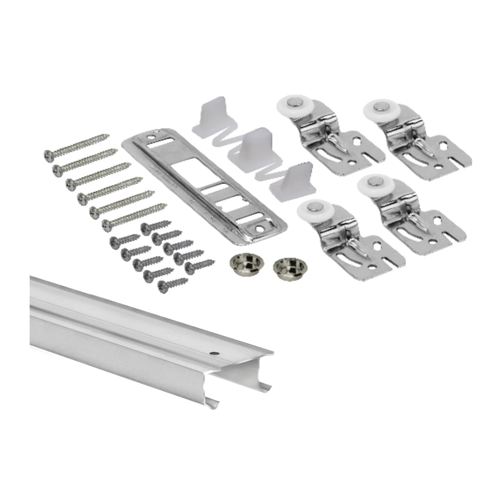 BP210K Bypass door hardware kit includes the hardware required to install two panels into a closet opening. Includes solid aluminum J-track able to hold 60 lb per panel and hangers. Easy to install and built for years of problem free use. Available in various lengths.