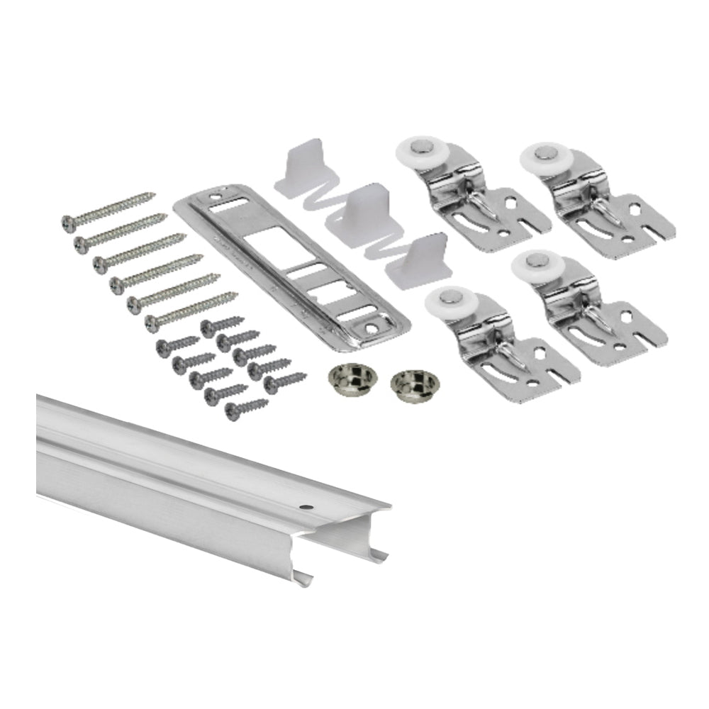 BP210K Bypass door hardware kit includes the hardware required to install two panels into a closet opening. Includes solid aluminum J-track able to hold 60 lb per panel and hangers. Easy to install and built for years of problem free use. Available in various lengths.