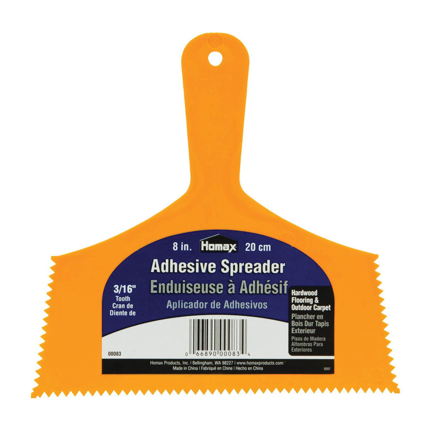 Reinforced handle and trowel design for strength. Beveled edges and notched blade sides for easy corner access. Heavy-duty, solvent-proof, resists softening and wear. 3/32 in size for vinyl flooring and floor tile, 1/8 in for carpet and vinyl tile, 3/16 in for wall tile and tile board, 1/4 in for ceramic floor tile and 3/8 in for heavy ceramic tile.