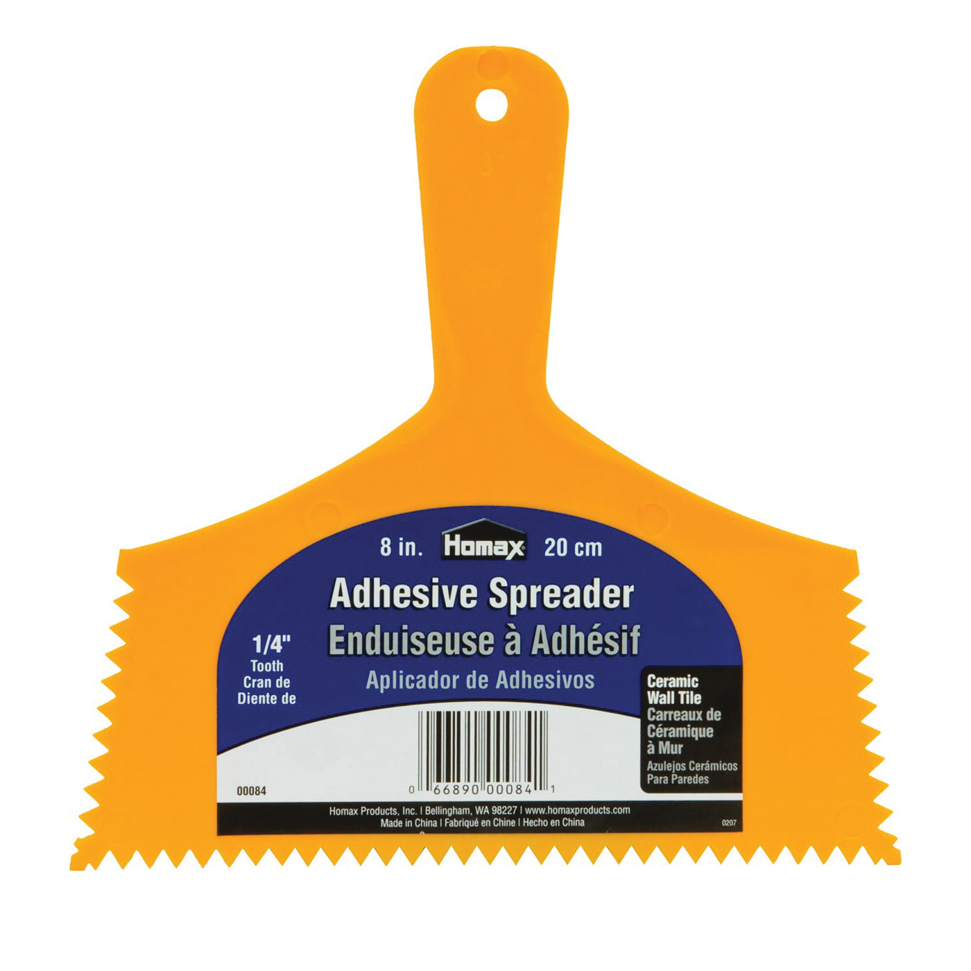 Reinforced handle and trowel design for strength. Beveled edges and notched blade sides for easy corner access. Heavy-duty, solvent-proof, resists softening and wear. 3/32 in size for vinyl flooring and floor tile, 1/8 in for carpet and vinyl tile, 3/16 in for wall tile and tile board, 1/4 in for ceramic floor tile and 3/8 in for heavy ceramic tile.