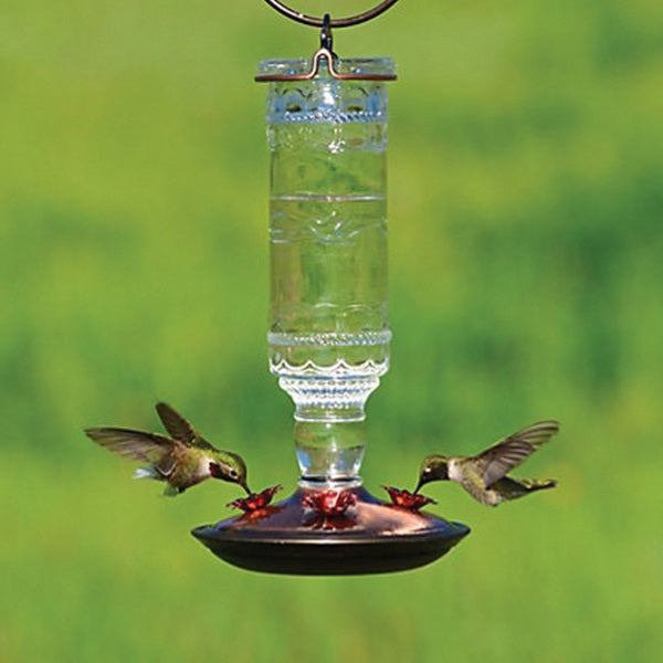 The Perky-Pet® antique bottle hummingbird feeder holds 10 oz of nectar and features a sea-green glass bottle with brushed silver accents. In addition, the feeder features four decorative flower feeding ports surrounding its base.
