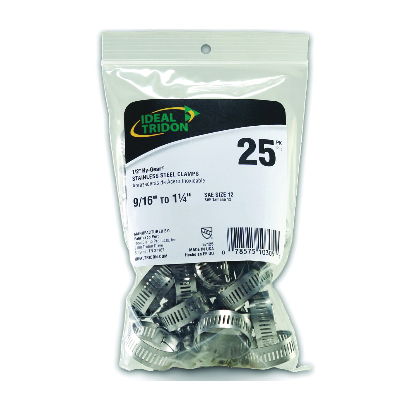 Ideal-Tridon Hy-Gear 67-6 Worm Gear Hose Clamp, Nominal Opening Size: 1/2 to 1-1/4 in, Hex Bolt Size: 5/16 in, Trade Size: #12, 316 Grade, 1/2 in W, Bolt Material: Stainless Steel, Stainless Steel