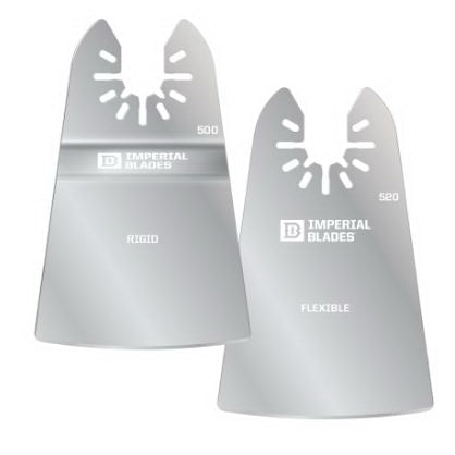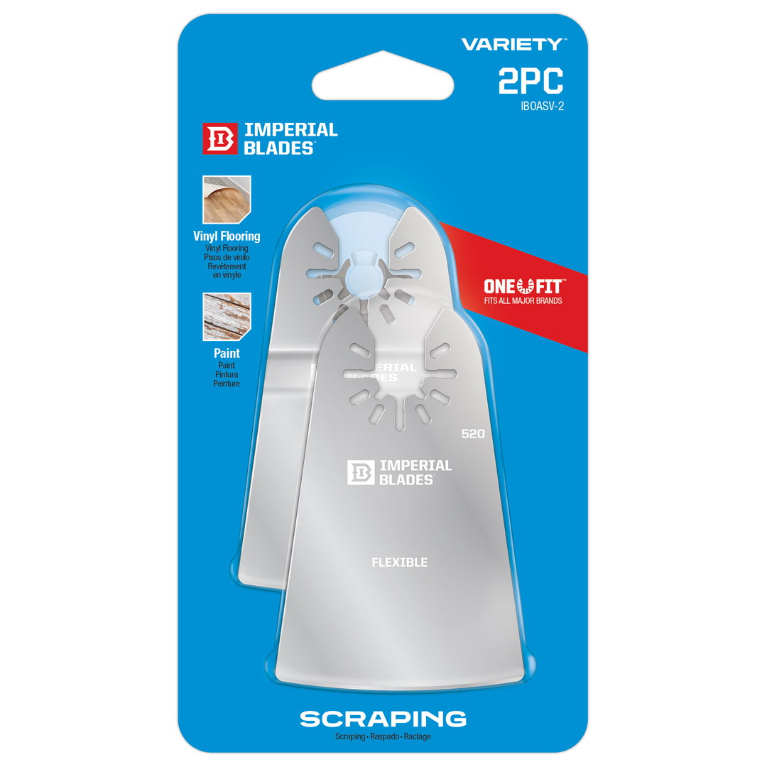 Imperial Blades ONE FIT Scraper Variety Pack, 2-1/4 in, High Carbon Steel, Applicable Materials: Adhesives, Vinyl Flooring, Carpet, Caulk, Sealant, Paint, Varnish and Foam Insulation, Silver, 3-3/8 in L, 2-1/4 in W, 0.093 in Thick, Suitable for: Black & Decker, Chicago Electric, Craftsman, DeWalt, Dremel, Metabo, Genesis, Hitachi, Makita, Masterforce, Milwaukee, Performax, Porter Cable, Ridgid, Rockwell, Ryobi, Worx, Tool Shop, Fein Multi-Master (to 3/2016), Kobalt, AEG, Hyper Tough and Mastercraft Tools, Includes: IBOA500 Rigid Scraper and IBOA520 Flexible Scraper