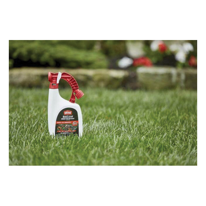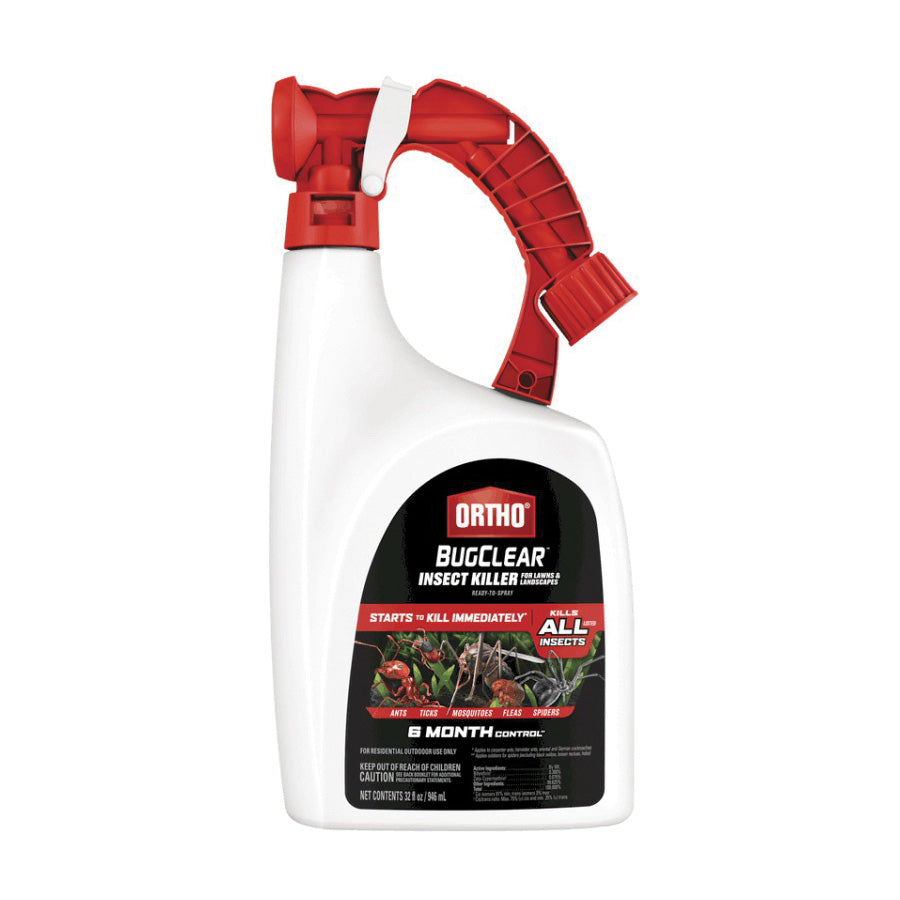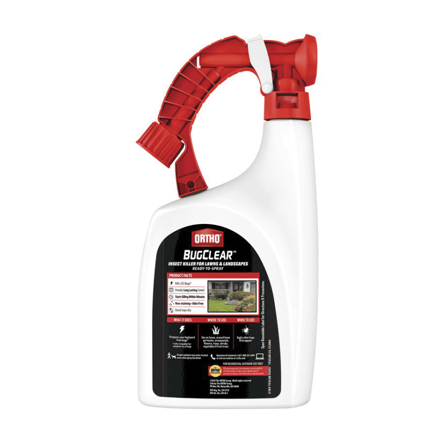 Kill outdoor insects with Ortho® BugClear™ insect killer for lawns and landscapes ready-to-spray bottle. Kills ants, ticks, mosquitoes, fleas, spiders, hornets, scorpions and other listed insects. It's easy to protect your backyard from bugs, just attach your hose to the sprayer. Non-staining and odor free, Ortho® BugClear™ insect killer for lawns and landscapes ready-to-spray starts killing within minutes and provides long-lasting control in your yard.