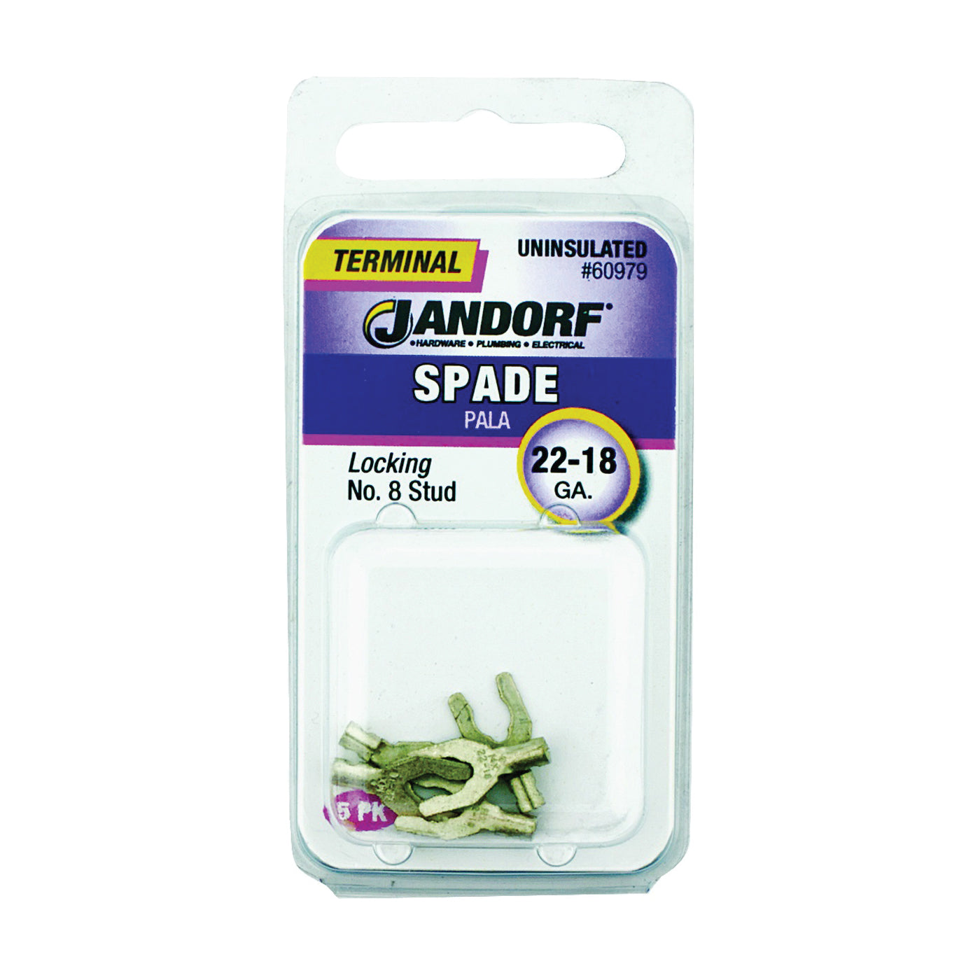 Jandorf Spade Terminal, 600 V, Wire Size: 22 to 18 AWG, Contact Material: Copper, Contact Coating: Tin, Stud Size: #8