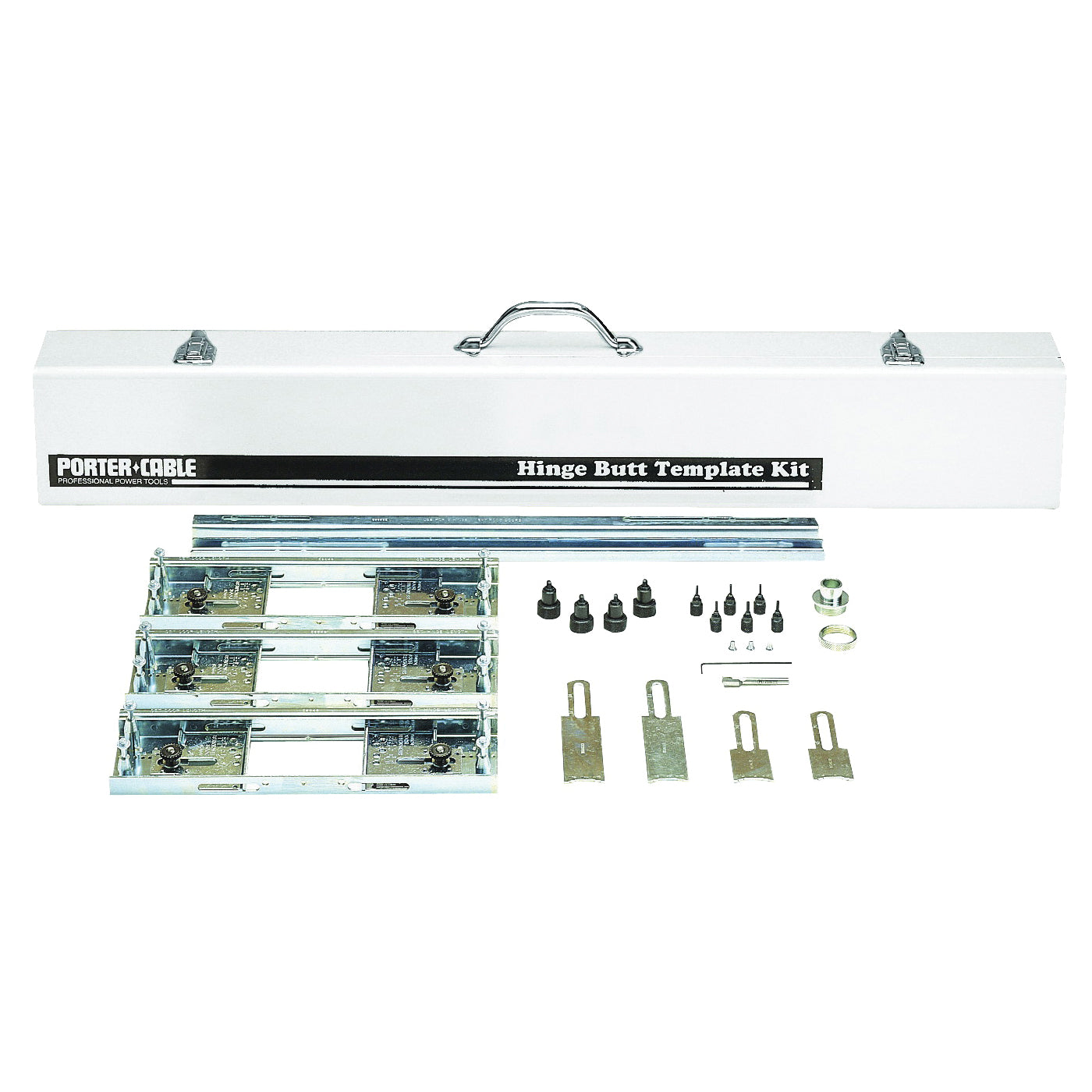 Porter-Cable Hinge Butt Template Kit, Plastic/Steel, Suitable for: All 1.5 hp and Larger Router, Includes: (4) Metal Hinge Templates, (3) Short Steel Rails, (2) Long Steel Rails, Carbide-Tipped Router Bit, Template Guide, Lock Nut, Corner Chisel, (2) Pairs of End Gauges, (8) Small Thumb Screws, (6) Large Thumb Screws, Hex Key, Carrying Case, Instruction Sheet