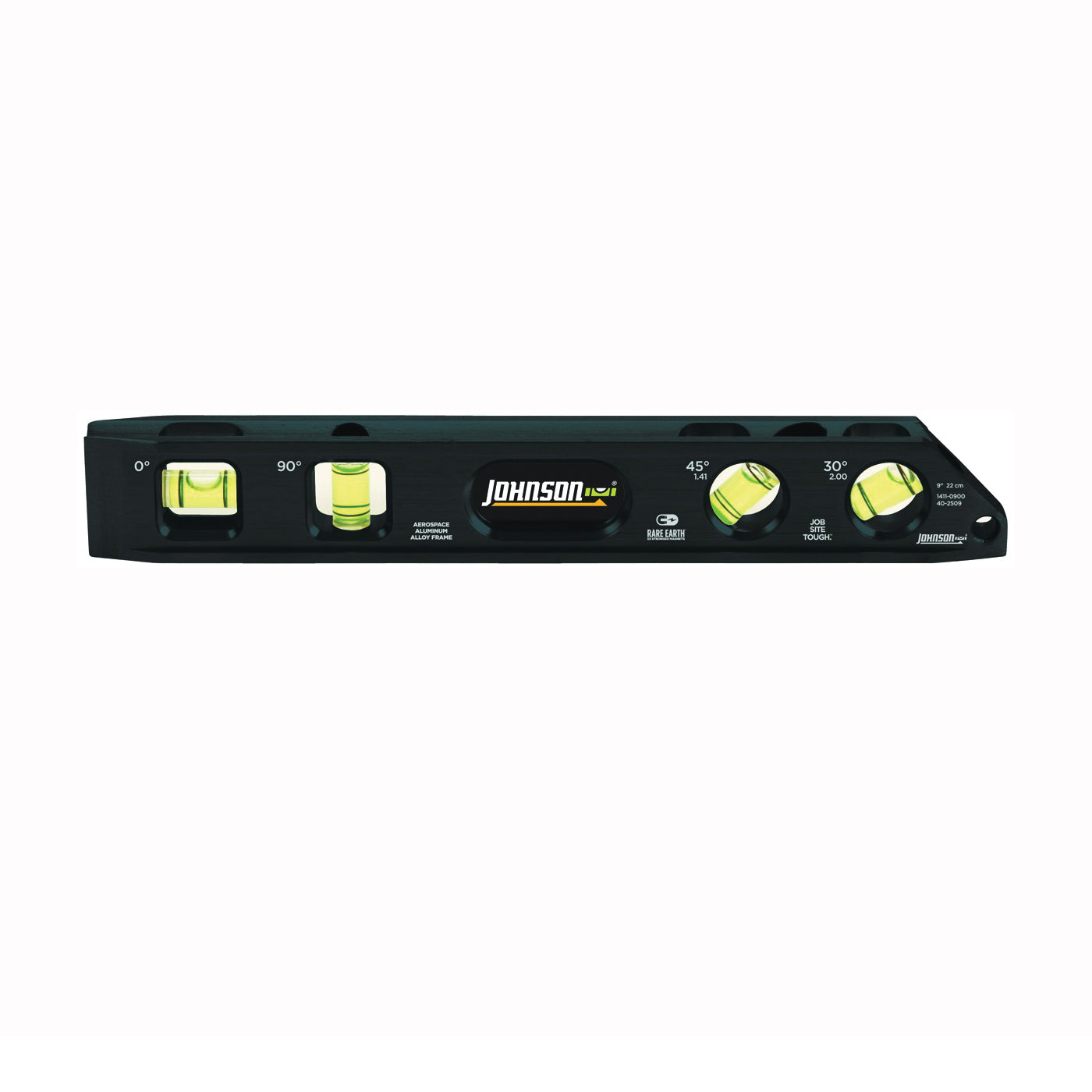 With four vials, this 9 in magnetic billet torpedo level accurately measures 0, 30, 45 and 90 deg. It features a solid billet aluminum frame for durability while its Powerful GripTight™ V-groove rare earth magnets hold to flat or round ferrous metal surfaces for convenient hands-free use. This level also includes machined vial openings for an accurate reading every time.