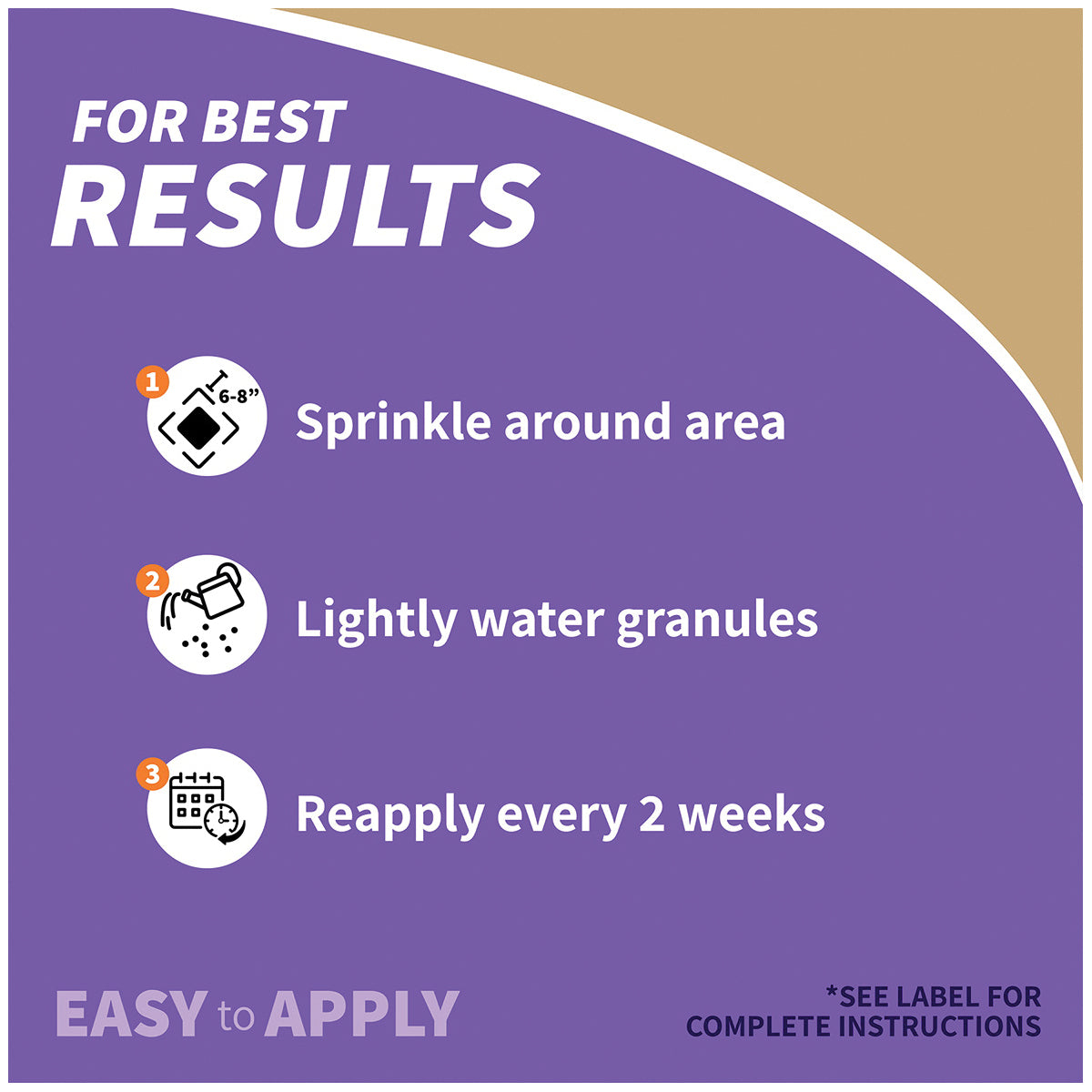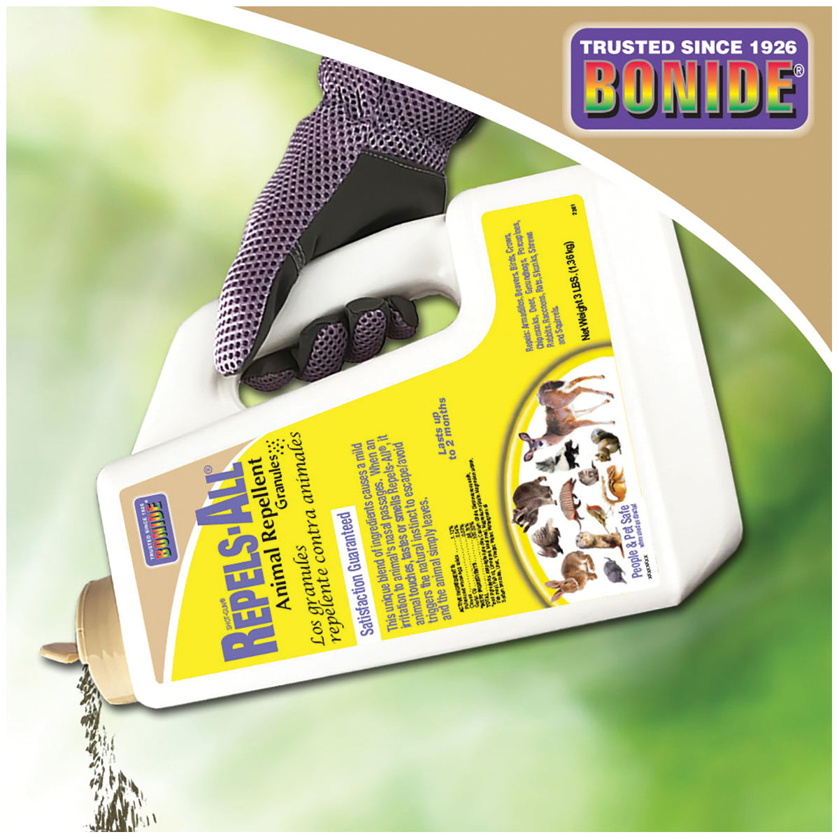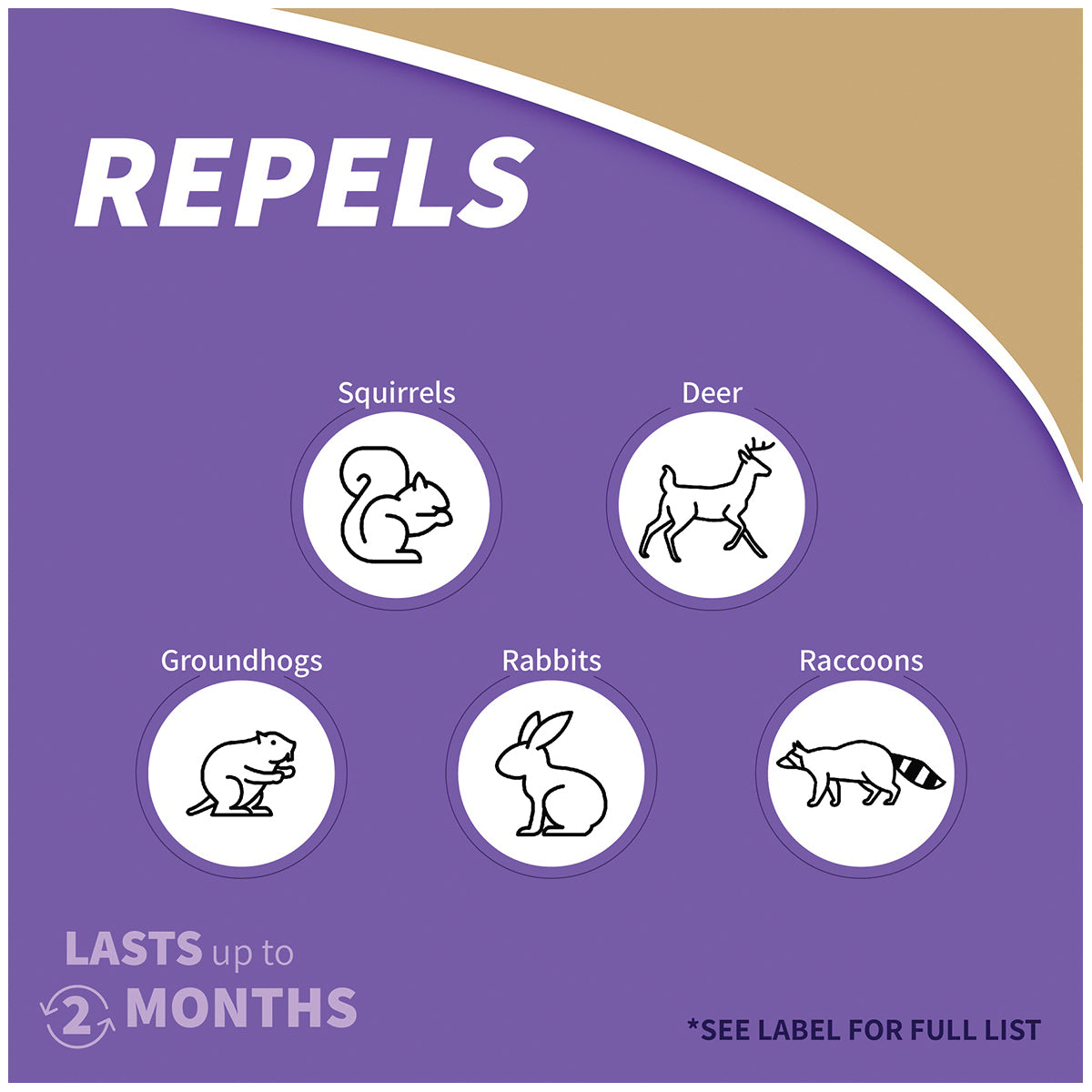 Repel nuisance animals including skunks, raccoons, squirrels, chipmunks, and many more from ornamental gardens and planting areas. Repels through smell, taste, and irritation of eyes and nose. The formula will not harm animals. Safe to use in pet and children's play areas when used as directed. Granules last up to 60 days.