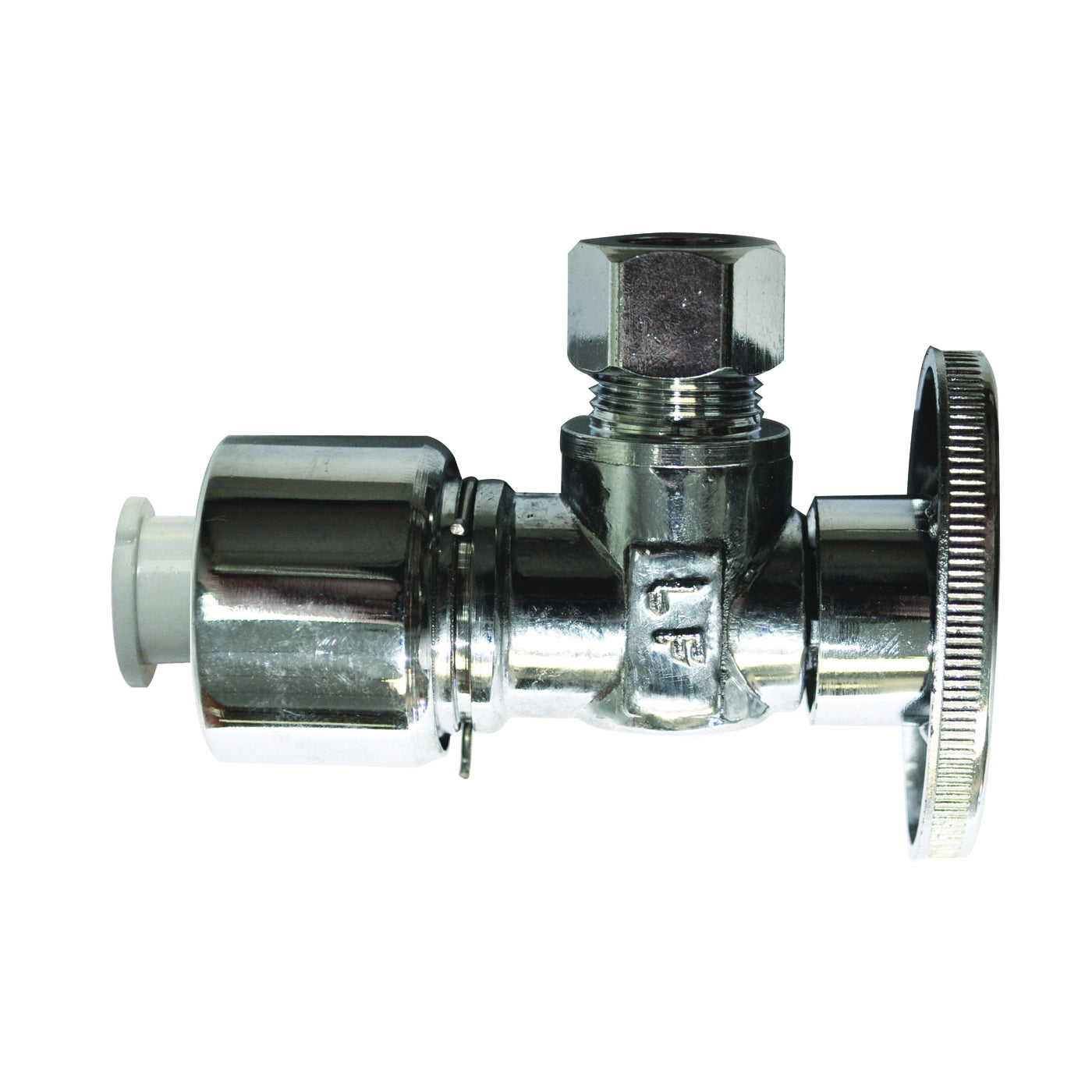 1/2. x 3/8 in OD. Valve pushes on to PEX, CPVC or copper, double O-ring seal, safety clip, Use for tight spots, a shorter stub out or finished wall/floor.