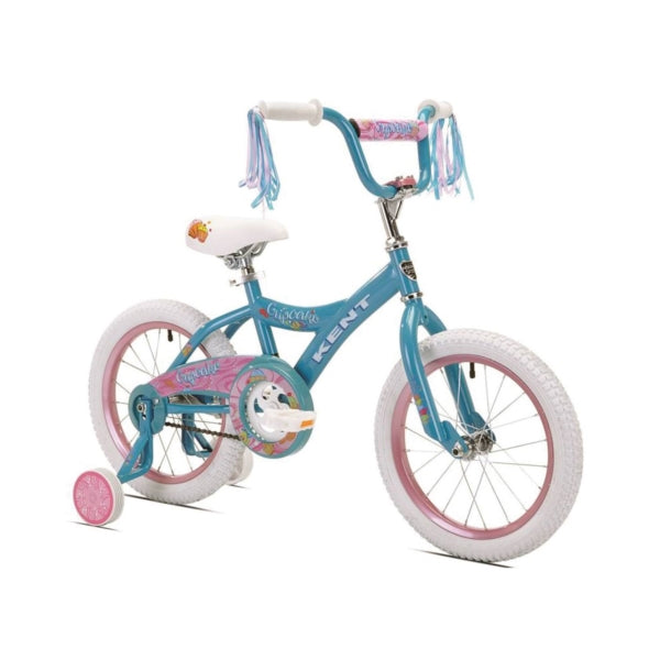 Surprise your little princess with the adorable 16 in Kent cupcake bike. This bike comes with a sturdy 10 in steel frame, knobby tires for a smooth ride and decorative streamers attached to the handlebars add a bit of flair. Plus, this kids bike has training wheels to help her learn to ride. Supports weight up to 70 lb.
