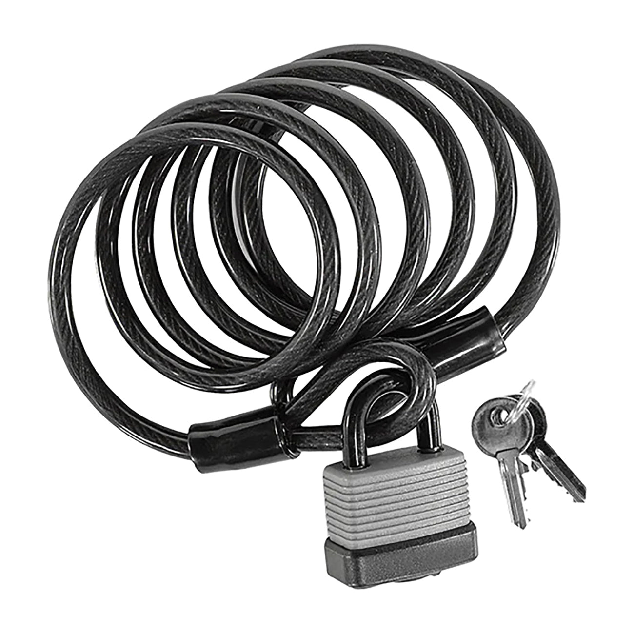 6 ft long cable easily reaches where you need it. Cable is 8 mm thick and covered in vinyl to prevent scratching. Heavy-duty steel padlock comes with two keys.
