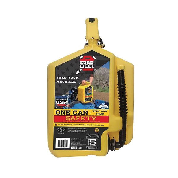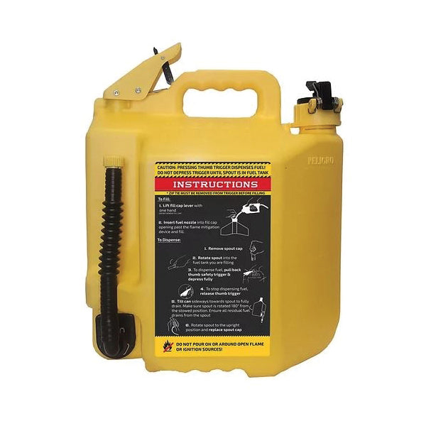 The flexible spout rotates down more than 180 deg and fits ideally into any machines fill location while the thumb release trigger on top controls the flow. This allows you access even the most awkward fill locations! By pulling straight back on the safety trigger and then down on the thumb button fuel is released immediately while you stay in complete control the entire time. When you notice your fill tank is almost full slowly release the thumb button and allow the excess fuel to drain from the top of the spout before rotating it back up. No more bending over and tipping your fuel can forward and holding it in an awkward position.