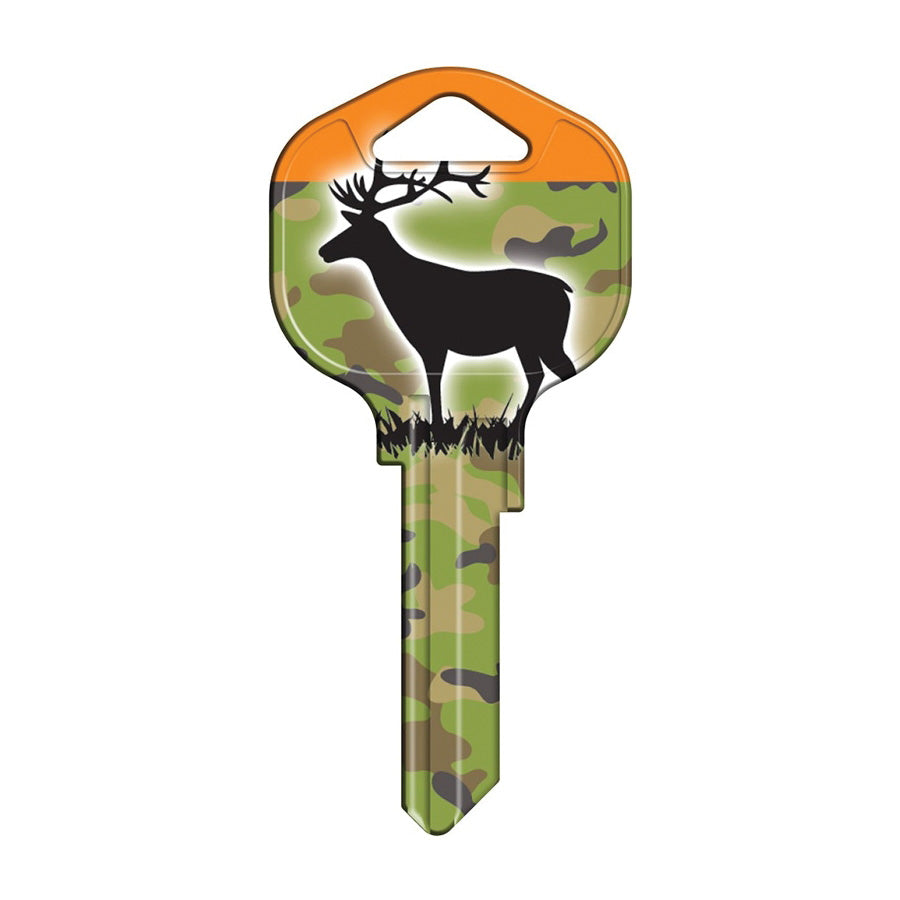 Hy-Ko Key Blank, Design/Theme: Deer with Camo, Key Number: KW1, Brass, Green, Nickel-Plated, Dimensions: 2 in W x 1/4 in D x 4 in H, Suitable for: Kwikset KW1 Keyways