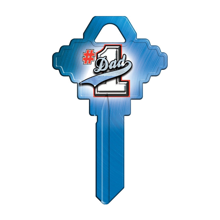 Hy-Ko Key Blank, Design/Theme: #1 Dad, Key Number: SC1, Brass, Blue, Dimensions: 2 in W x 1/4 in D x 4 in H, Suitable for: Schlage SC1 Keyways