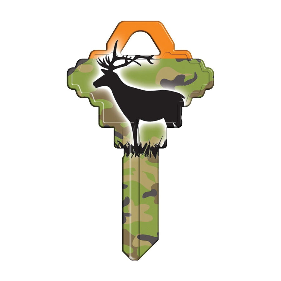 Hy-Ko Key Blank, Design/Theme: Deer with Camo, Key Number: SC1, Brass, Green, Dimensions: 2 in W x 1/4 in D x 4 in H, Suitable for: Schlage SC1 Keyways